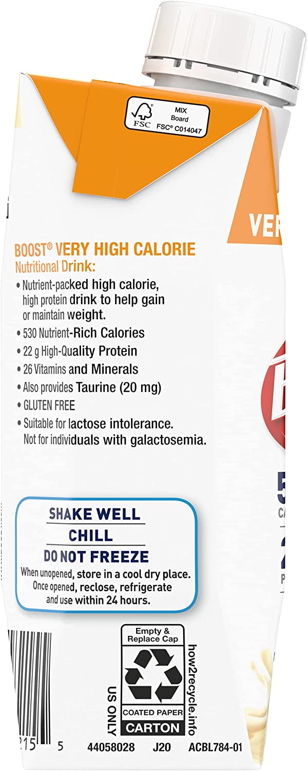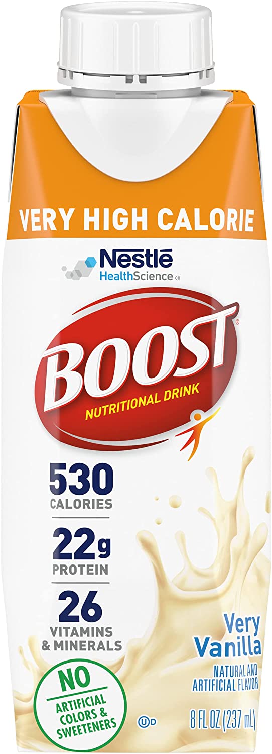 Very High Calorie: BOOST Very High Calorie is a calorically-dense and nutrient packed nutritional drink and can be used as a snack or mini meal for those with low appetites; Available in Vanilla, Strawberry, & Chocolate flavors.