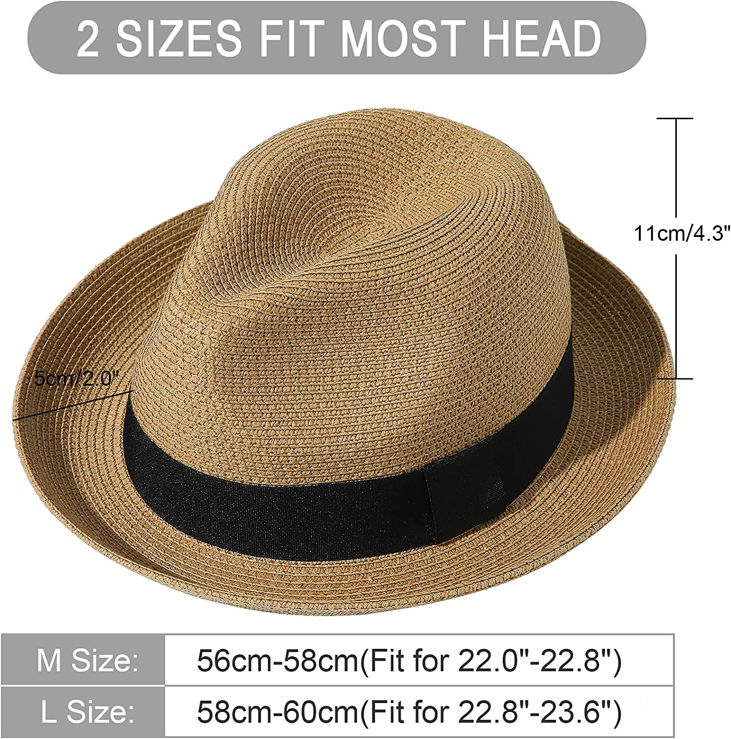 Available in two sizes, our Straw Fedora Hat is designed to fit most head sizes. The Medium Size 57-58.5cm (Fit for 22.5"-23") and Large Size 58.5-60cm (Fit for 23"-23.6") provide a perfect fit for both men and women.