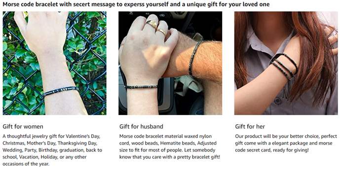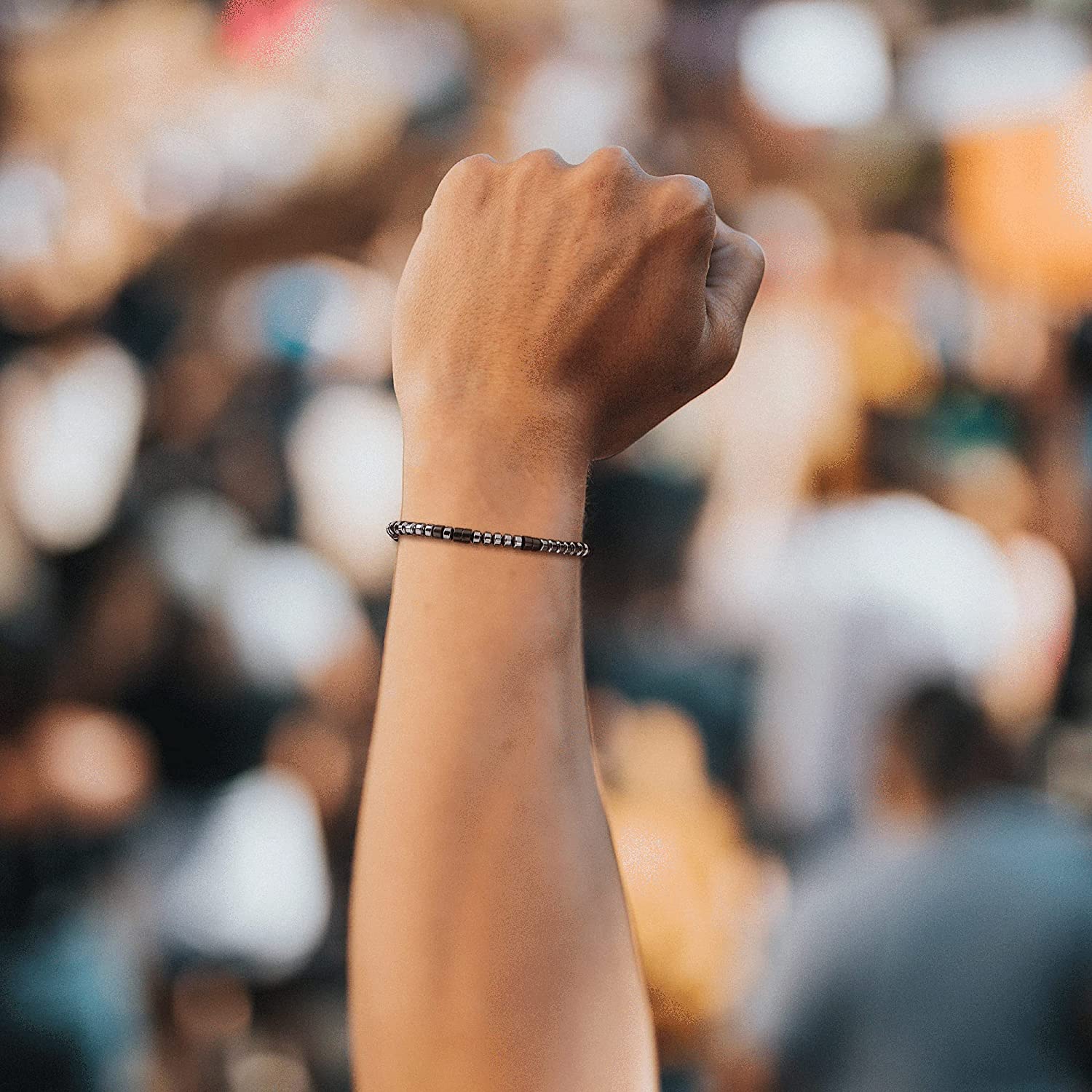• The stainless steel bead on the bracelet represents a "dot" in code, and the hematite bead represents a "dash".