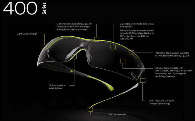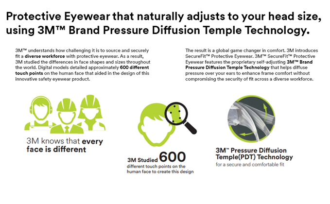 3M SecureFit Protective Eyewear is designed to diffuse pressure over the ears through 3M’s proprietary Pressure Diffusion Temple Technology. The glasses automatically adjust to the head and facial features of the wearer. Weighing less than 1 ounce, the durable, snug fitting, flexible nature of SecureFit offers a more comfortable and personal fit than old fashion “one size fits all” glasses. The snug fit also keeps the glasses securely in place as the wearer looks up and down or side to side, eliminating the need for frequent repositioning. The anti-fog coating on the lenses helps reduce the chances of fogging in hot and humid environments. Removable foam lined gasket helps keep debris out of your eyes while providing comfort and cushioning. Meets the High Impact Requirements of CSA Z94.3-2007 and the High Impact Requirements of ANSI Z87.1-2020.
