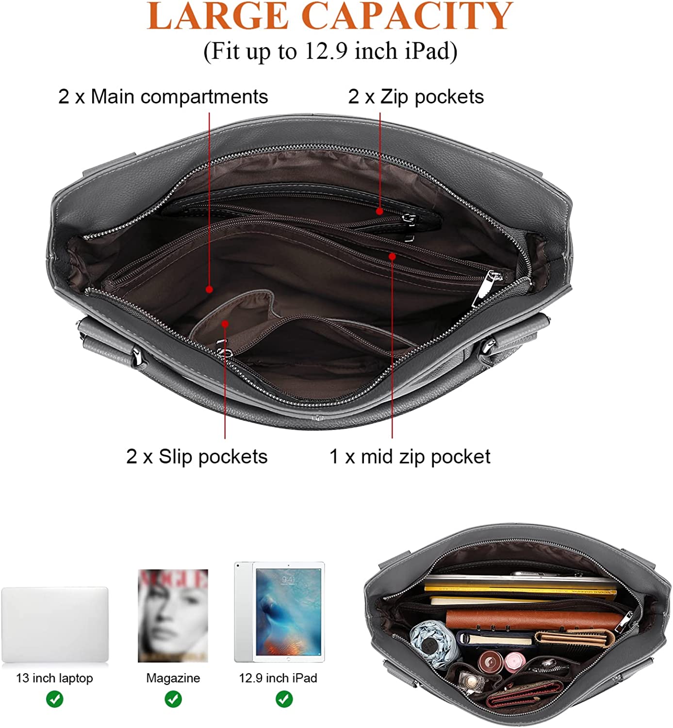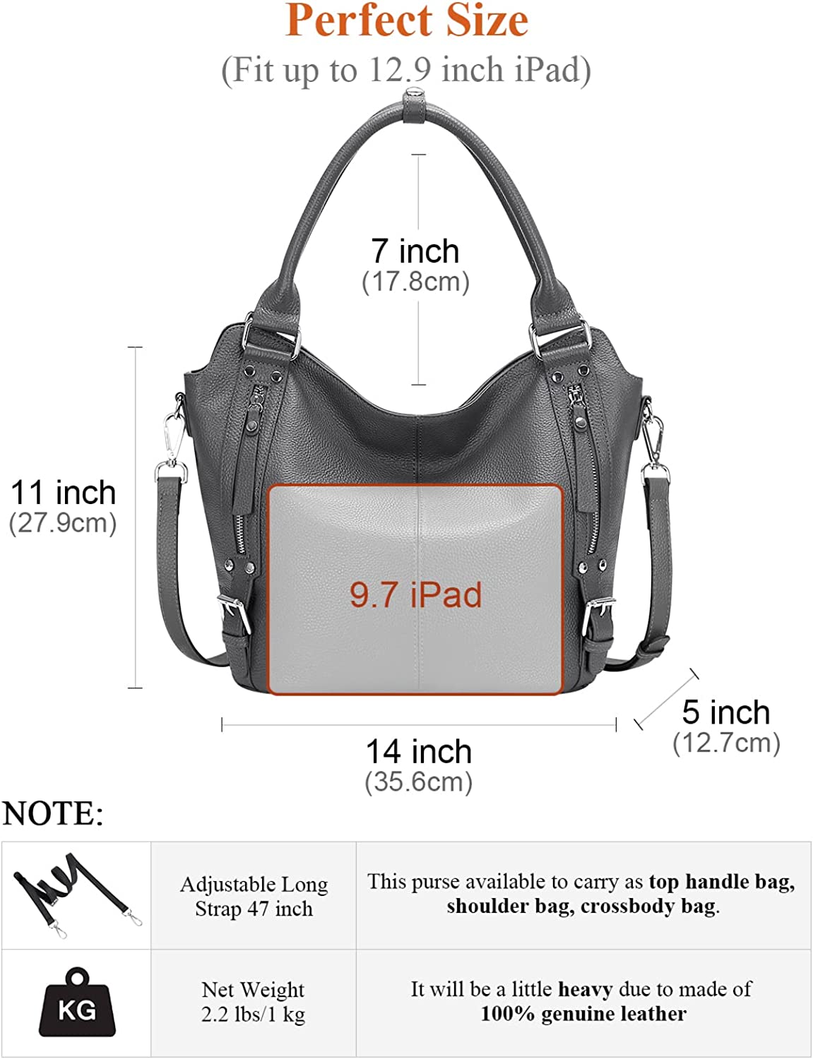 • WELL STRUCTURE -- EXTERIOR: 2 small front zipper pockets, 1 back zipper pocket. INTERIOR: Zipper open to one large compartment with 2 slot pockets and 2 small zipper pockets. This leather hobo tote bag availabve to hold your 12.9 inch iPad, 12inch Macbook Pro, sunglasses, wallet and other essentials.
