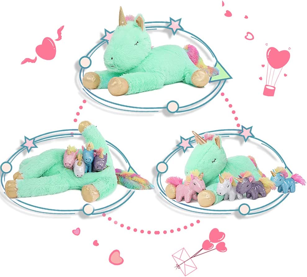 - UNIQUE DESIGN:There is a zipper on the belly of the unicorn. When you open the zipper, you can see 4 little unicorns inside it.