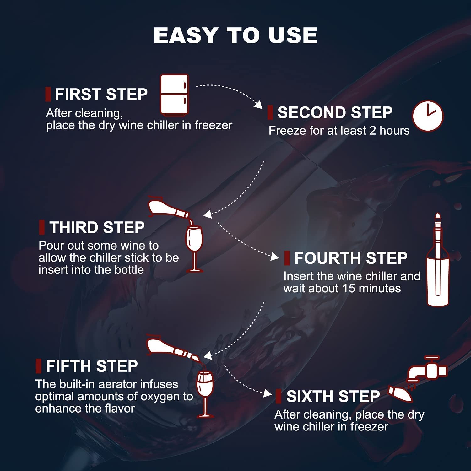 • ? EASY TO USE - Just put it in the freezer for about one hour before using until the cooling gel in the chiller stick is frozen. After pouring a little wine out of bottle, insert wine chiller into bottle and enjoy perfectly chilled wine for up to two hours. Drip-free pouring spout to avoid any drips or spills.
