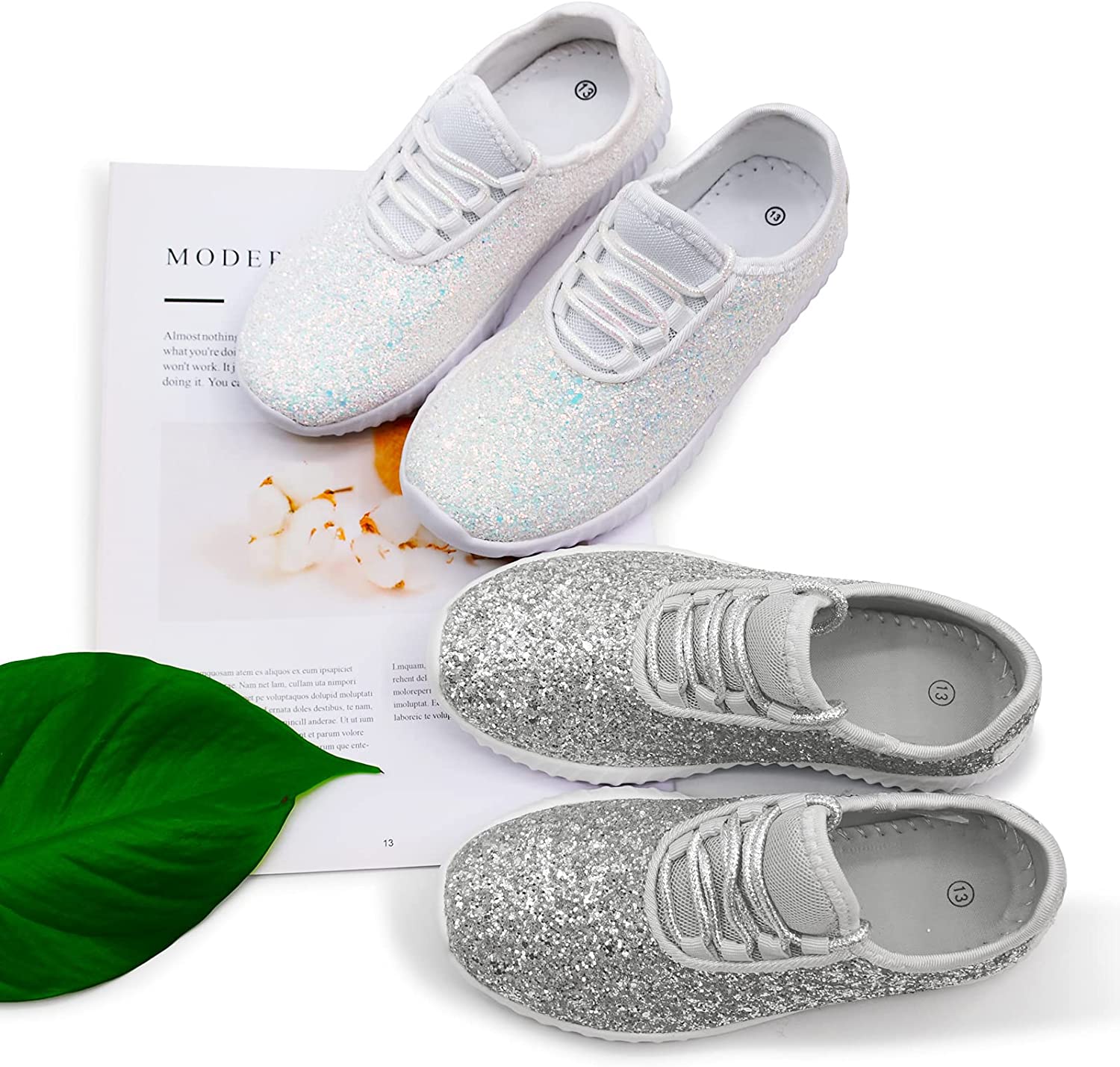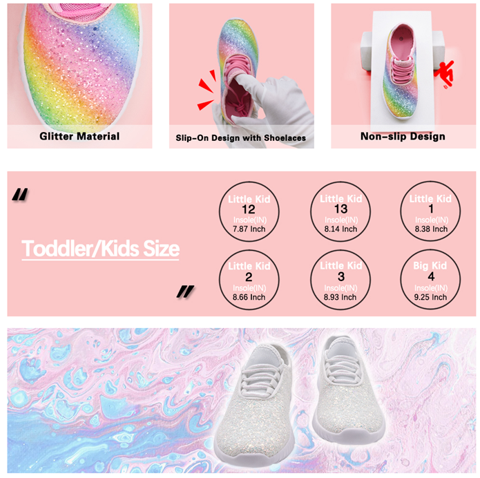 Girls Glitter Sneakers: This glitter sneakers will surely make you love it!Designed with glitter fabric and metallic sequins,make your shoes look unique and shiny.Slip-On design with shoelaces that fits your feet more and easy to put on and take off.Highlight the cuteness of girls/children