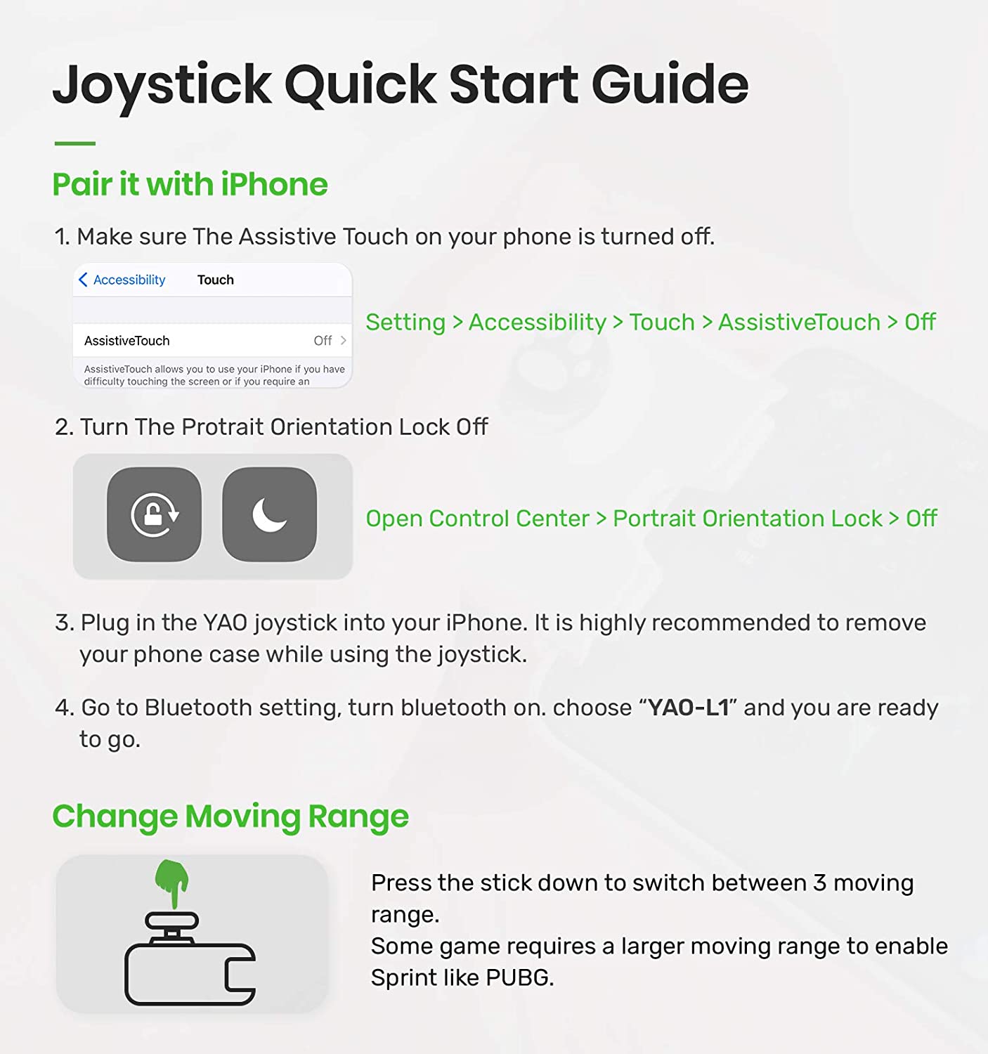 Plug and Play: The YAO Mobile Joystick Compact and lightweight, fits in your pocket. No baterry inside, low power consumption. For the best gaming experience, it is highly recommended to remove your phone case before plug in the joystick.