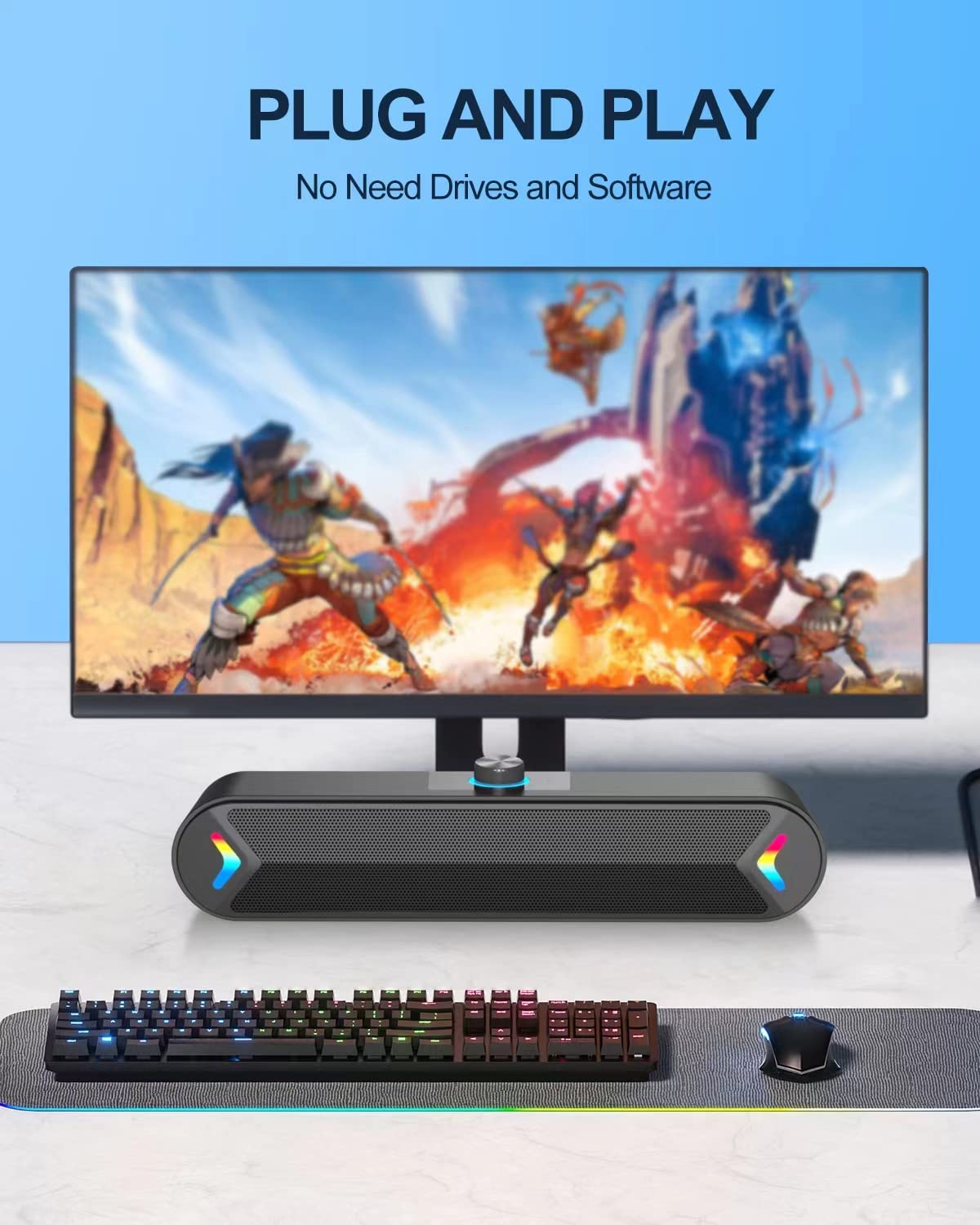 - Colorful Breathlight Design:Colorful light is perfect for your homes, offices and workspaces to enhanced happy atmosphere.You can turn on/off the light by the control button on the sound bar.