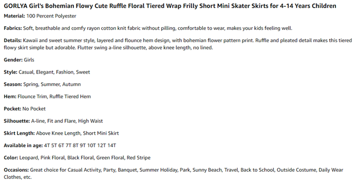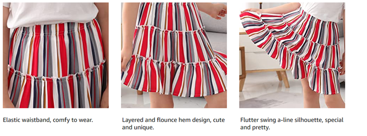 Features: Cute and refreshing casual summer style, layered and ruffle hem design, with bohemian pattern print. High elastic waist makes this pleated circle skirt fit and beautiful. Flared swing aline silhouette, above knee length, no lined.