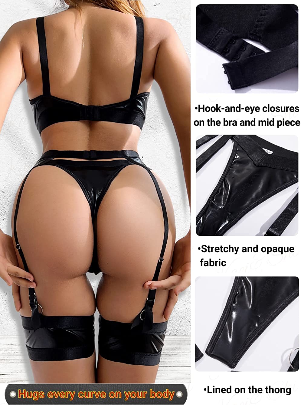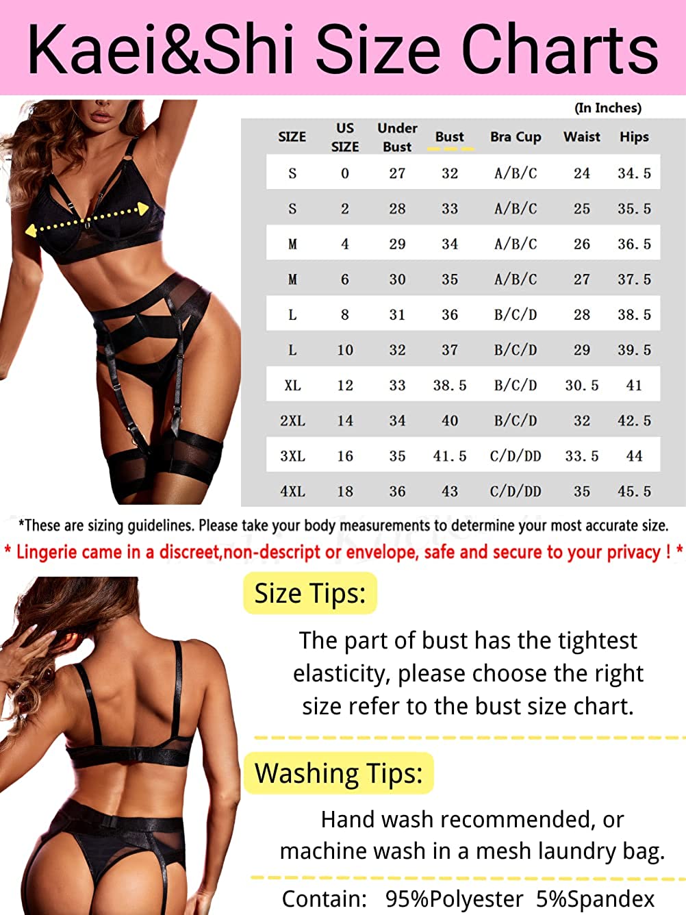 ✿Feature: This matching bra and panty set with belt and thigh bands is featured with strappy, high leg, metal ring, sheer mesh which shows your curve beautifully.