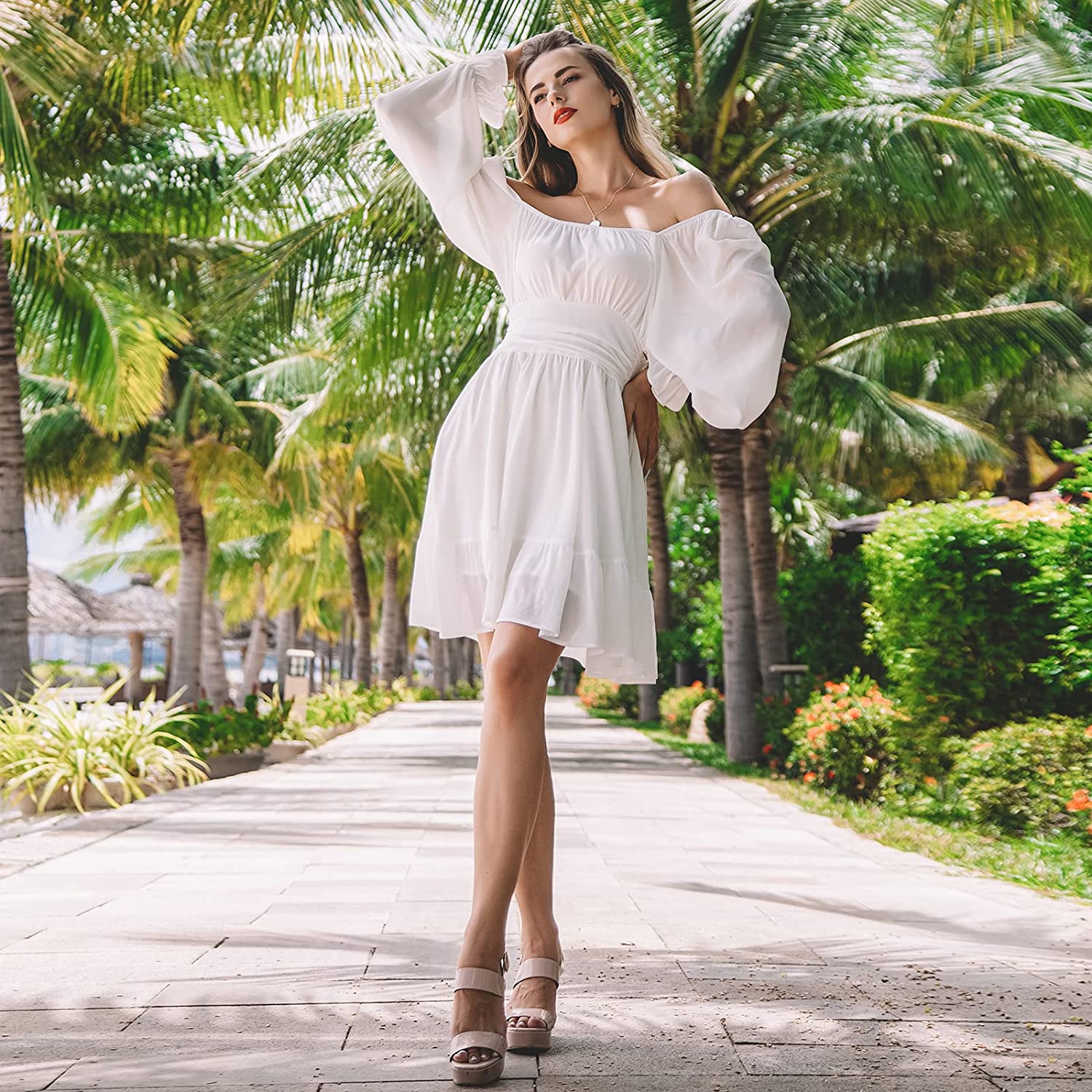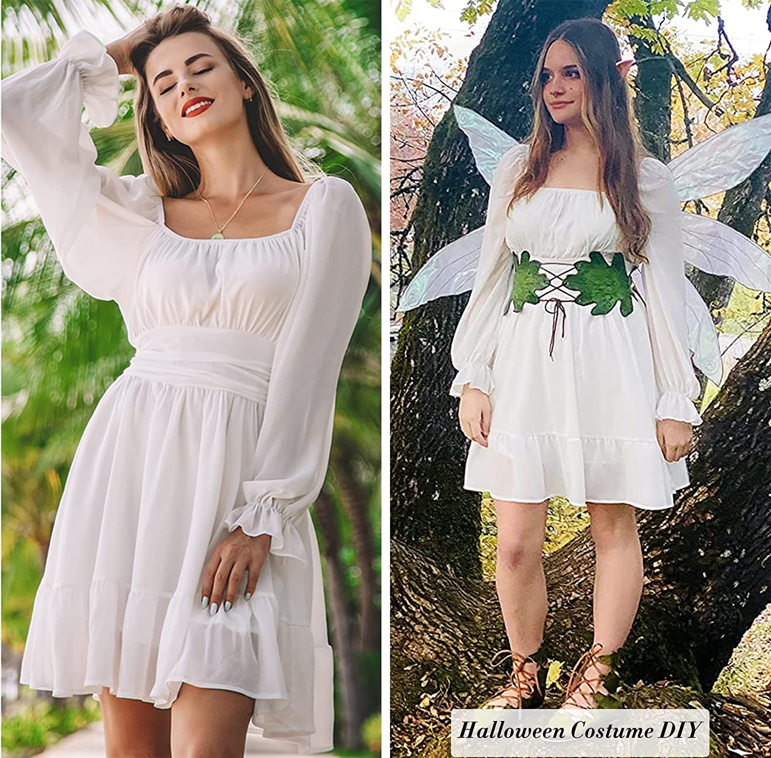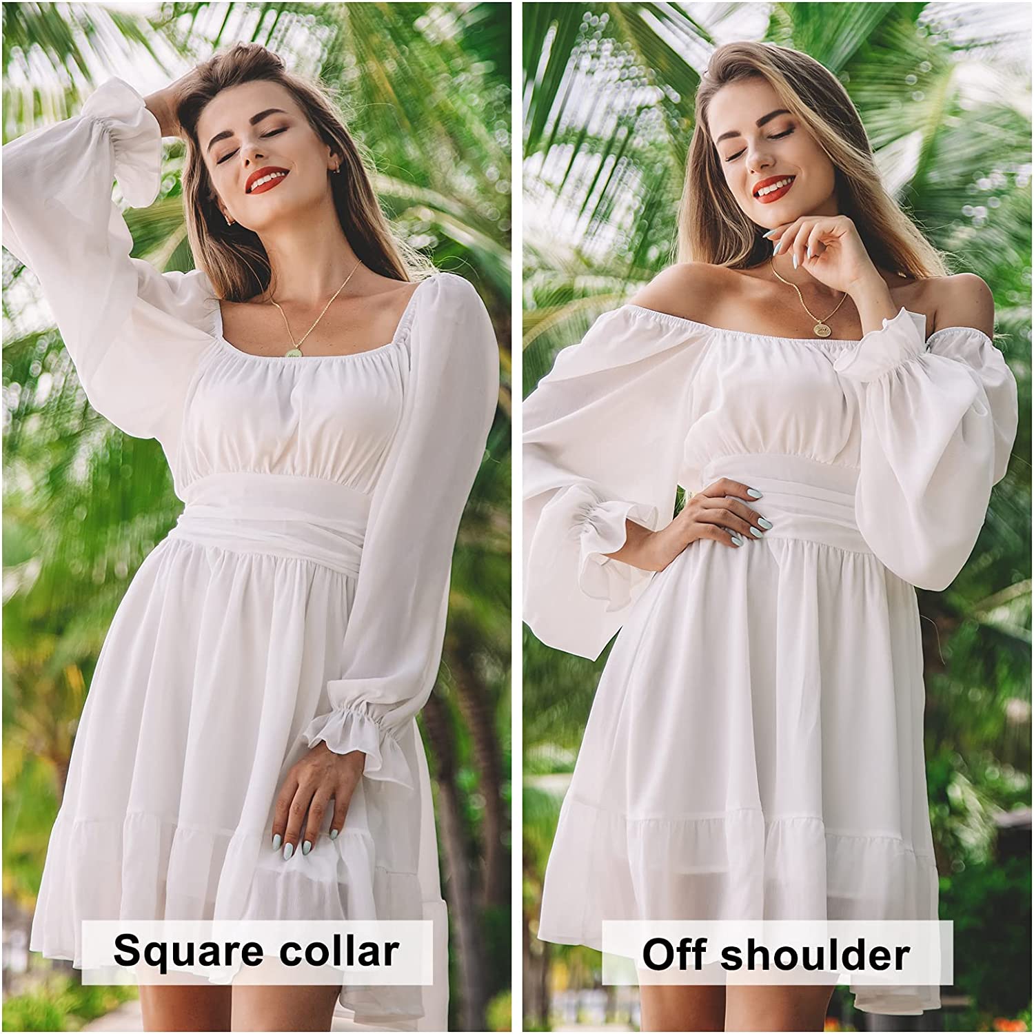 EXLURA Women Tie Back Wedding Guest Dresses Long Lantern Sleeve Square Neck Ruffle Elastic Waist Aline Casual Mini Dress