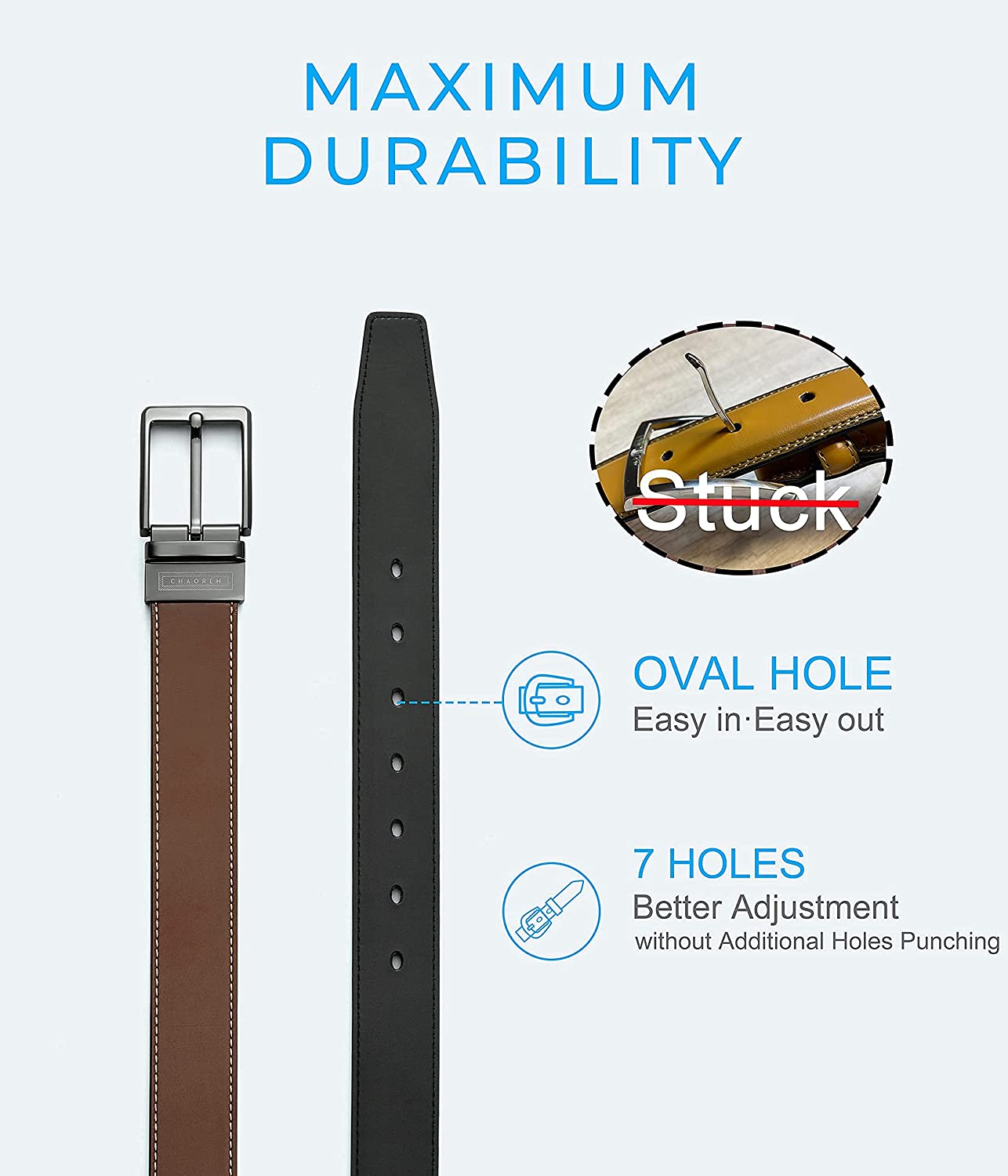 EASY IN EASY OUT - CHAOREN reversable belt have 7 oval holes,Extra 2 holes are for adjustment and gift ideas. For best fit, order a size 2" larger than your waist size.