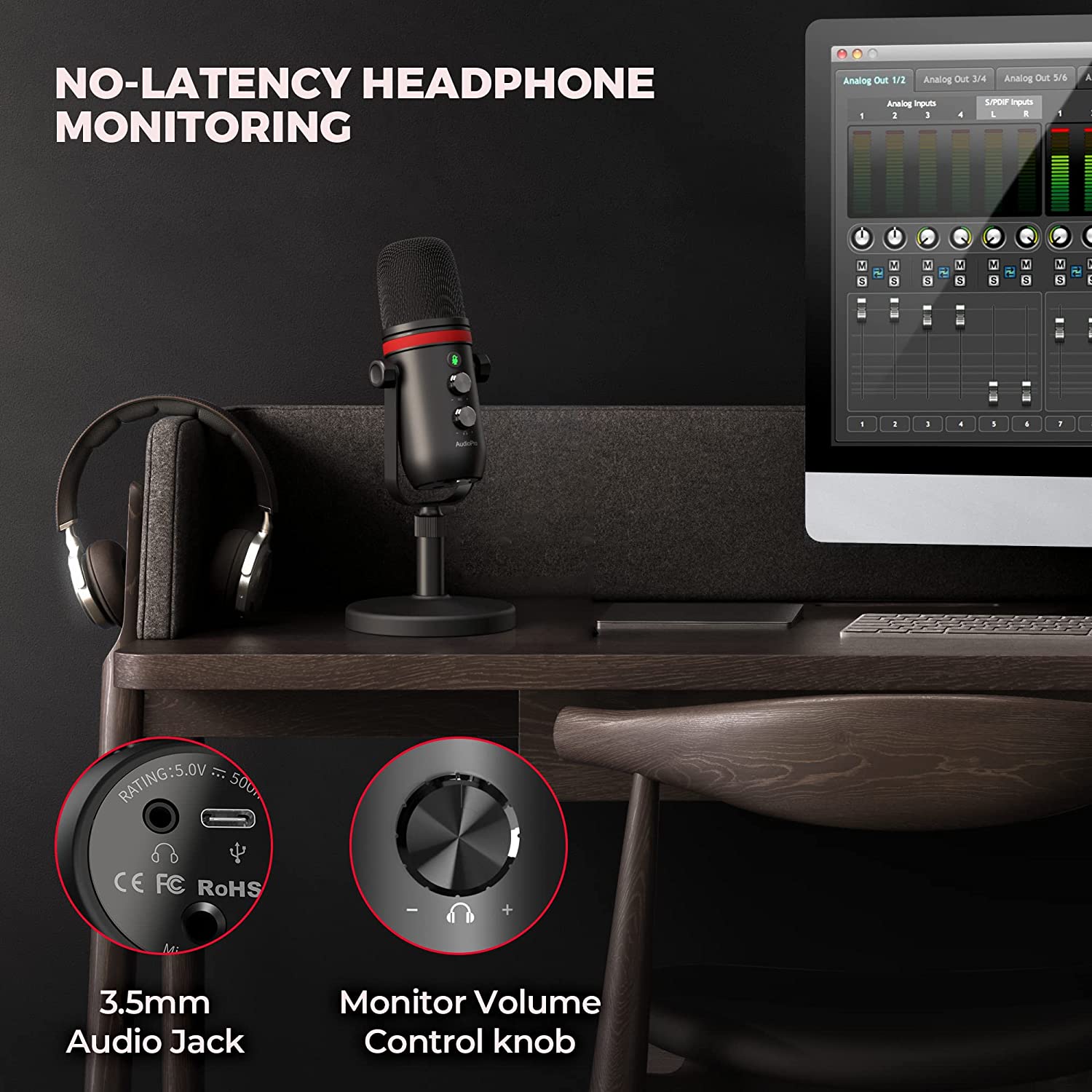 AUDIOPRO USB Microphone - Computer Condenser Gaming Mic for PC/Laptop/Phone/PS4/5, Headphone Output, Volume Control, USB Type C Plug and Play, LED Mute Button, for Streaming, Podcast, Studio Recording