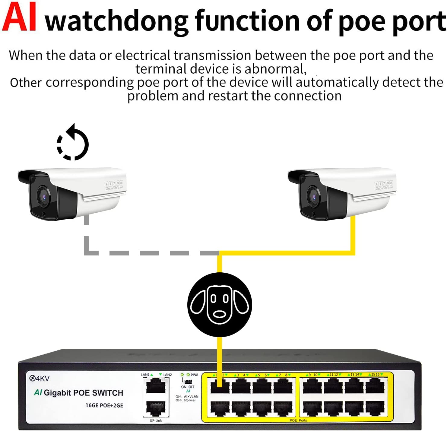 【VLAN mode 】VLAN mode(Turn on the AI switch) support isolate 16 PoE+ port from each other. It is easy for this 16 port PoE switch to manage and maintain, Prevent broadcast storms, Prevent data confusion, Wireless networking application data is more stable.