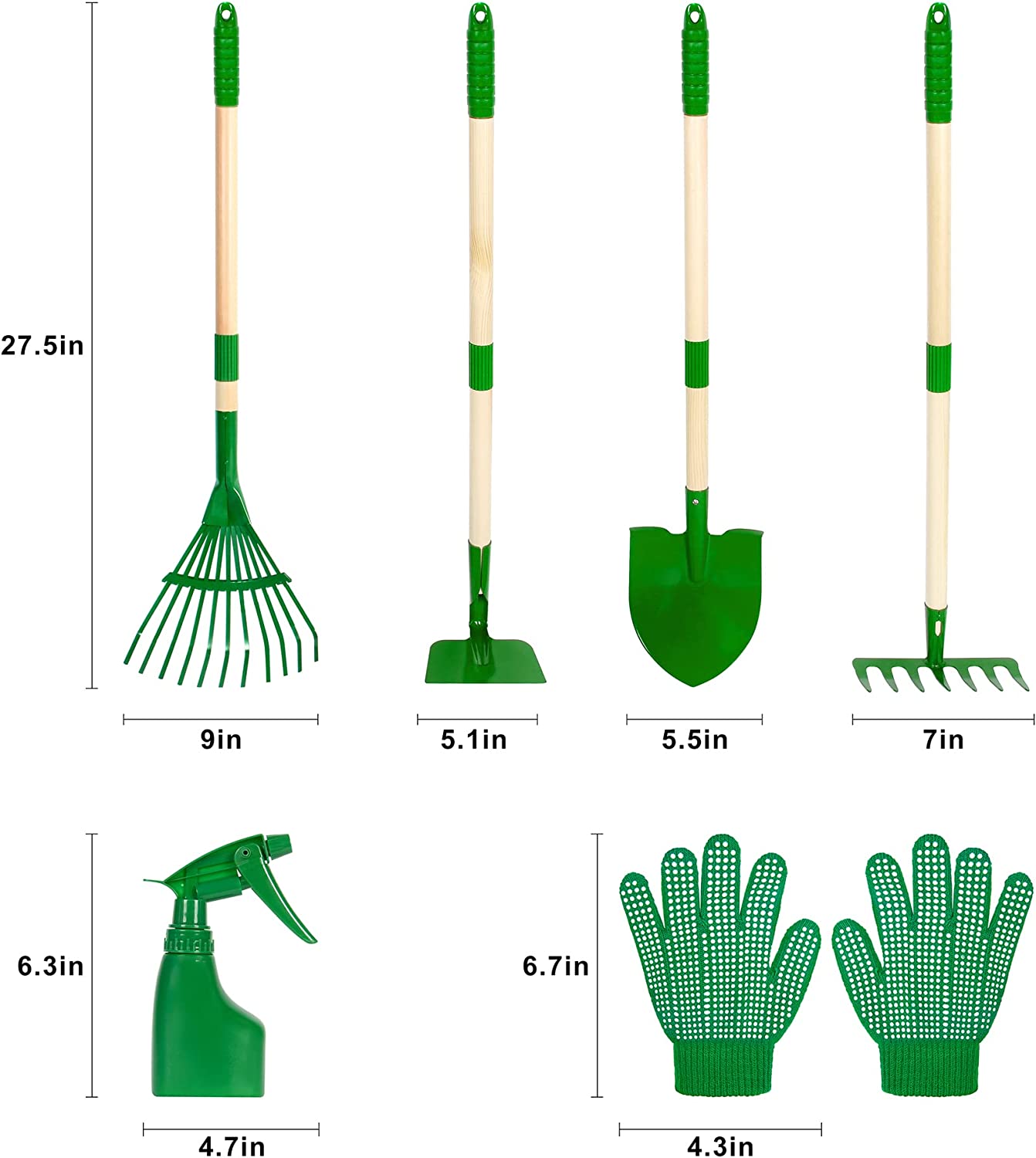 6 PCS KIDS GARDEN TOOLS: Toddler gardening tools set include Shovel, Rake, Hoe, Leaf Rake, kids custom gloves and a spray bottle (3 morphological transformations). Children's custom gloves are perfect for protecting their hands from injury while gardening activities!