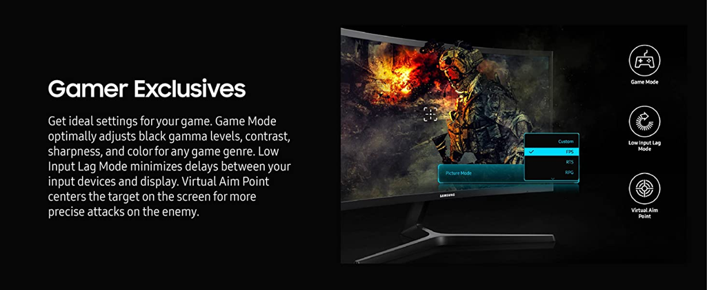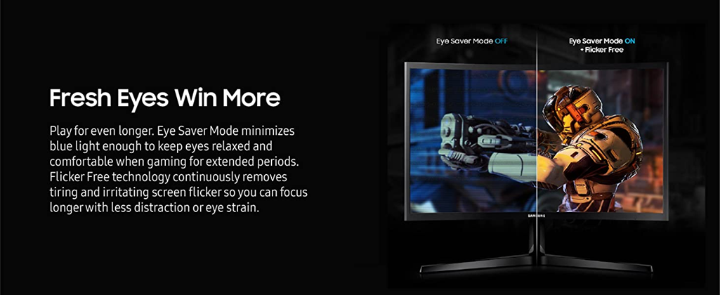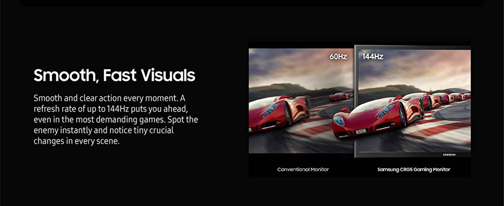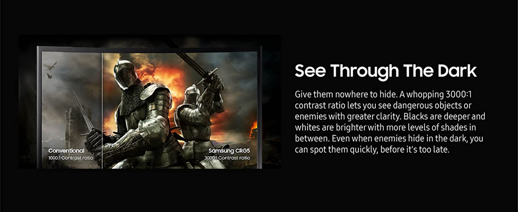Samsung CRG5 Curved Gaming Monitor allows gamers to get fully immersed in with the1800R curved screen. No matter what you are playing, get the feeling of being pulled in as your game's world wraps around you, and enjoy smooth and clear action every moment. A refresh rate of up to 144Hz puts you ahead, even in the most demanding games. Spot the enemy instantly and notice tiny crucial changes in every scene. Get ideal settings for your game with exclusive gaming features. Game Mode optimally adjusts black gamma levels, contrast, sharpness, and color for any game genre. Low Input Lag Mode minimizes delays between your input devices and display. Virtual Aim Point centers the target on the screen for more precise attacks on the enemy. No more choppy gameplay. AMD Radeon FreeSync™ eliminates image tears for exceptionally smooth, fast-action gaming. With a dynamically adapted display refresh rate, even the most complex game scenes are seamless and virtually stutter-free. Play for even longer. Eye Saver Mode minimizes blue light enough to keep eyes relaxed and comfortable when gaming for extended periods. Flicker Free technology continuously removes tiring and irritating screen flicker so you can focus longer with less distraction or eye strain. Give them nowhere to hide. A whopping 3000:1 contrast ratio lets you see dangerous objects or enemies with greater clarity. Blacks are deeper and whites are brighter with more levels of shades in between. Even when enemies hide in the dark, you can spot them quickly, before it's too late.