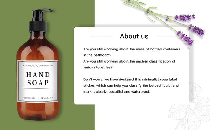 These water resistant soap labels are perfect for organizing the bathroom and kitchen soap dispenser. The soap label stickers are designed in a minimalist style to improve the aesthetic looking of your bathroom/kitchen, matching any home style.