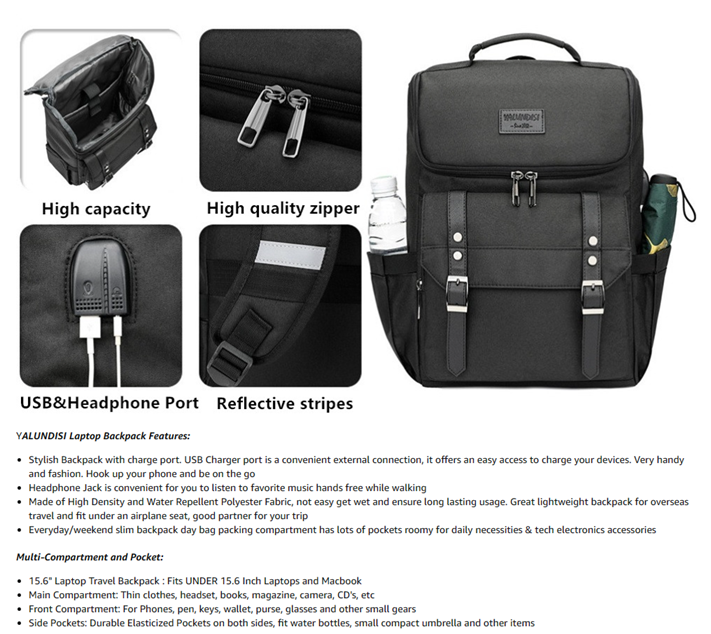 • USB Port Design: With built in USB charger outside and built in charging cable inside,this usb backpack offers you a more convenient way to charge your phone while walking. Please noted that this backpack doesn't power itself, usb charging port only offers an easy access to charge