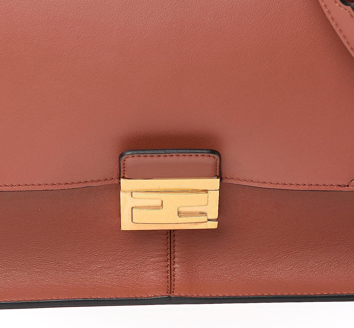 This "Kan U" shoulder bag is crafted of calfskin leather in a rust brown color. The handbag features an adjustable leather shoulder strap. The front flap opens with a gold-tone push-lock to a spacious brown suede and navy blue leather lined interior with a patch pocket. This is the perfect everyday bag, from Fendi!