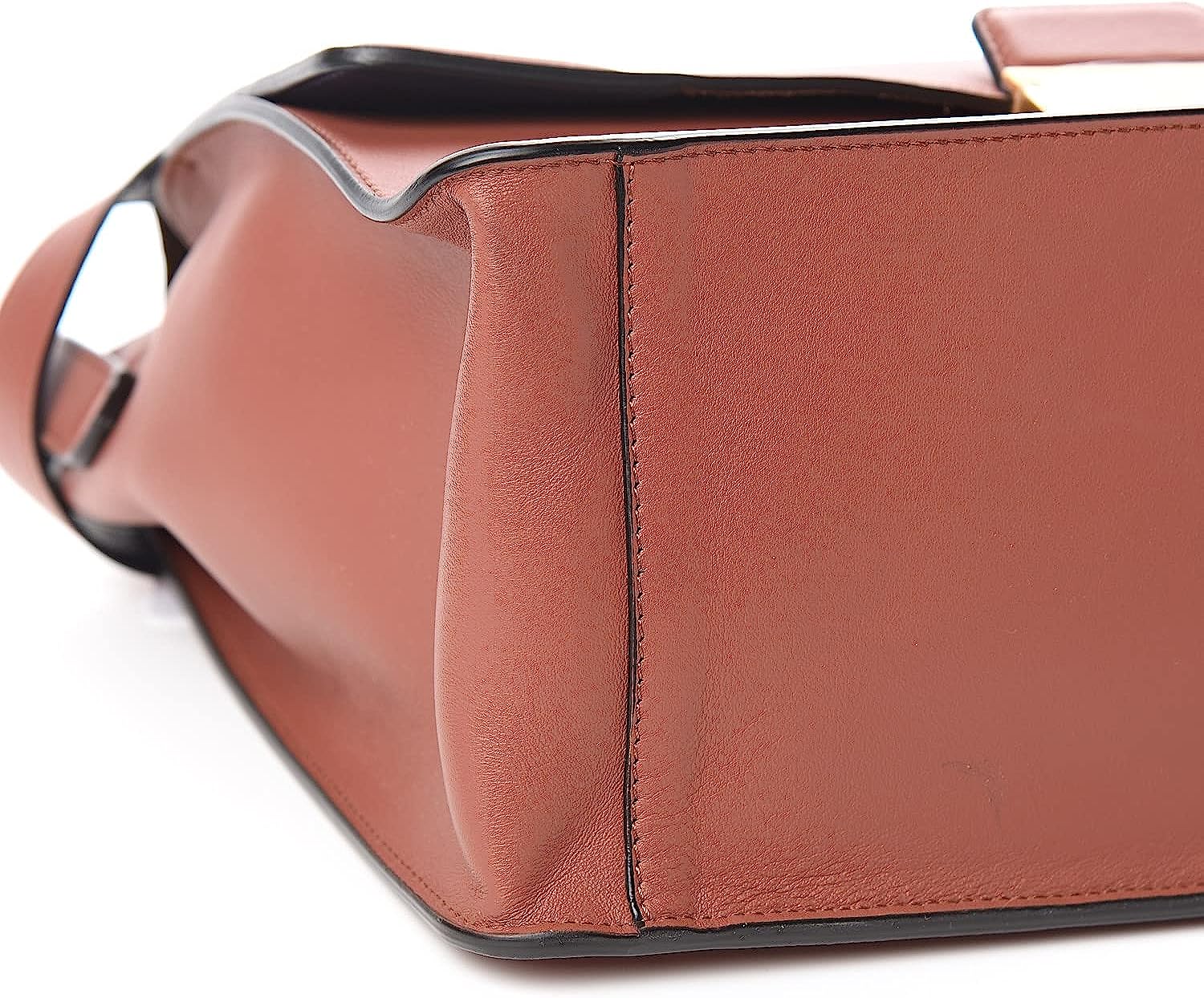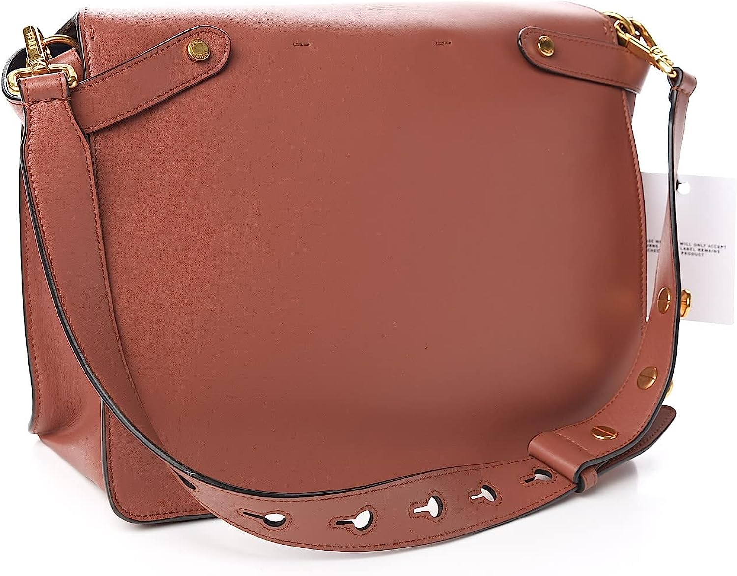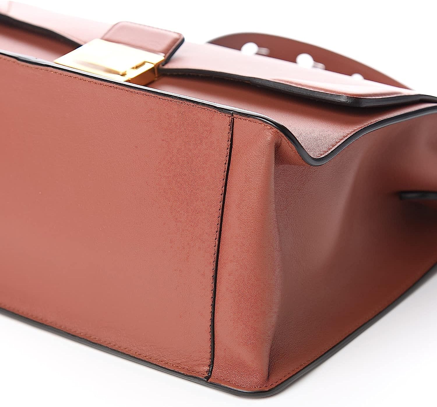 Color: Rust Brown. Calfskin Leather. Gold-tone hardware. Push-lock closure. Interior brown suede and navy blue calfskin leather lining. One interior slip pocket with snap closure