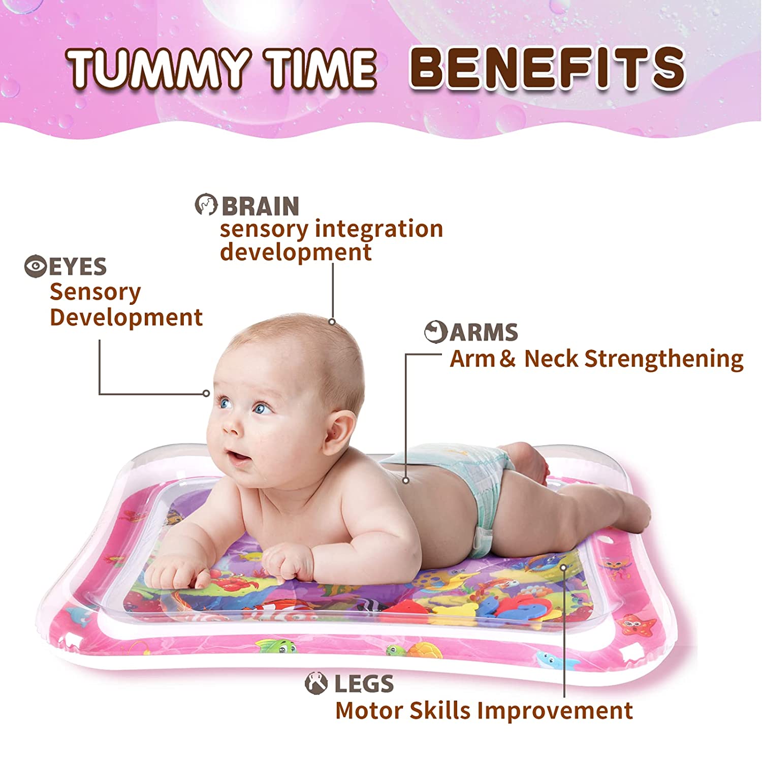 Stimulates baby development, essential early development tool: Sensory and motor development, the soft and comfy inflatable tummy time activity mat is the perfect baby water sensory toy for developing solid head, neck, and shoulder muscles as well as refining the hand-eye coordination, fine motor, and social skills. It is a sensory delight that enhances brain development. Baby grows and gets stronger which encourages your baby to learn to roll over and crawl more quickly.