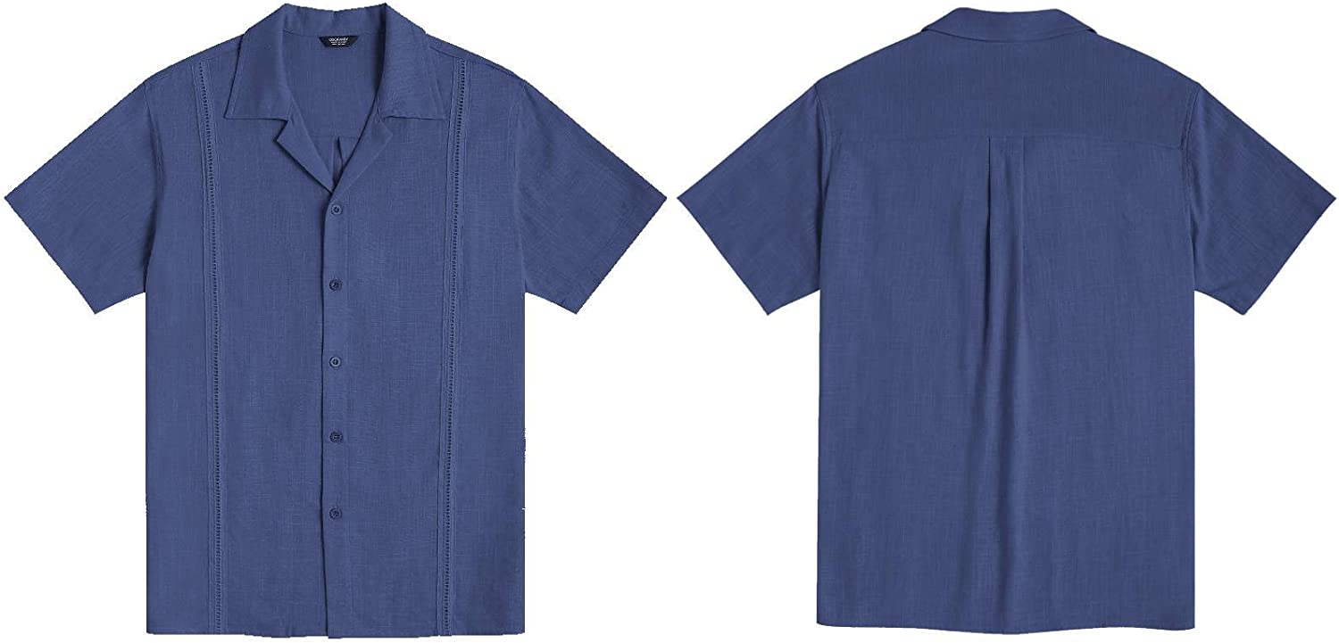 • CLASSIC DESIGN --- Distinct cuban style, geometric pintuck embroidery each side of the front chest, button closure, short sleeve, relaxed fit. Premium linen fabric provides unsurpassed comfort and high performance.