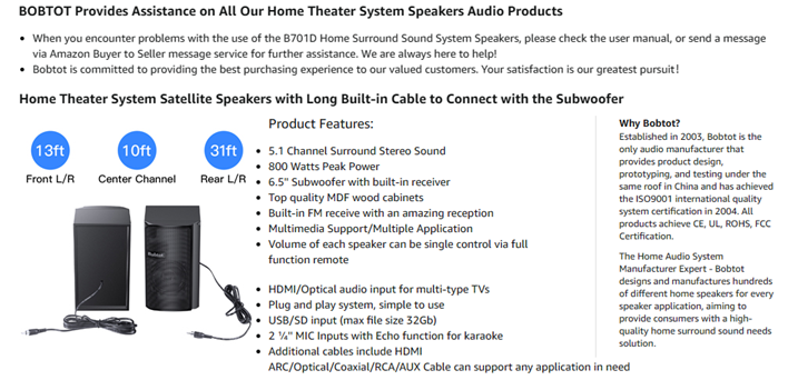 - 5.1 Channel Surround Stereo Sound: Bobtot surround sound system has two modes of 5.1/2.1 channel, switch via remote control or front panel. Pro surround function provides you with more advanced enjoyment. Via the Remote you can also independently control the volume of each speaker and the subwoofer