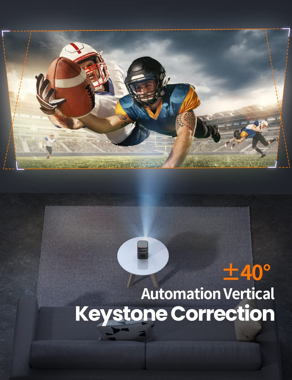 - ?【PORTABLE & AUTOMATIC KEYSTONE CORRECTION】:With a design more minor than the size of a soda can, this mini projector allows you to enjoy your favorite movies anywhere at home.This wireless projector has a built-in rechargeable battery, which can provide 2.5 hours of video on 1 charge, meeting outdoor needs. This pocket projector supports automatic vertical ±40° keystone correction, which helps to correct the image quickly.