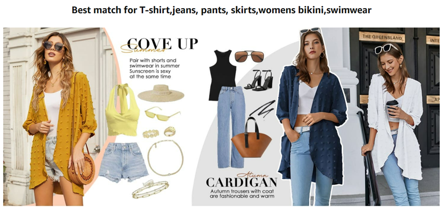 Ideal as swimsuit cover ups/beach cover up/bathing suit kimono cover ups, Casual Loose kimono tops, cardigans for cool summer nights and indoor air conditioned places, etc.