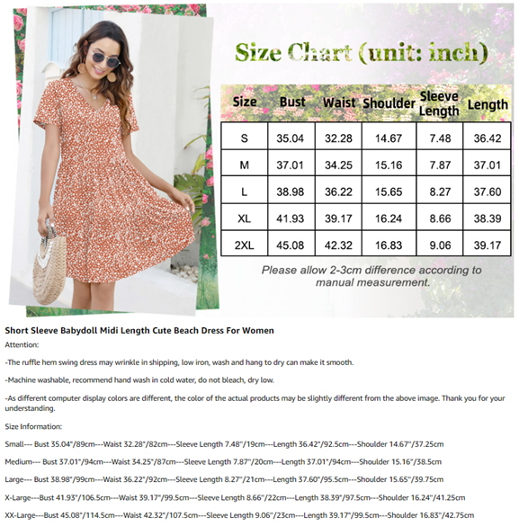Notes: Machine or hand wash with cold water, do not bleach, no dry clean. No wrinkle, no shrinkage, no fading. Please refer to size chart carefully before purchasing this sun dress/sexy dresses for women/sun dresses women summer casual/floral dress for women/tshirt dresses for women/boho dress for women.