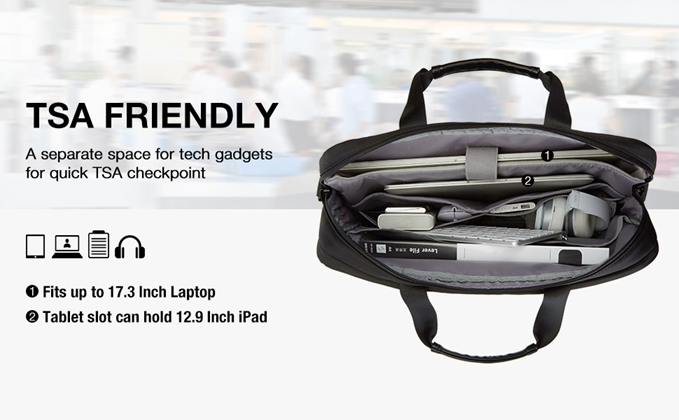 - TSA FRIENDLY & ANTITHEFT- Convenient at checkpoint. A separate tech compartment with large opening design can make you quickly pass at airport security, also keeping your 17.3 inch laptop, 12.9'' iPad and other tech gadgets tidy. Its metal anti-theft zippers will enhance the security of the computer bag.