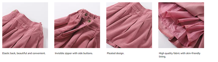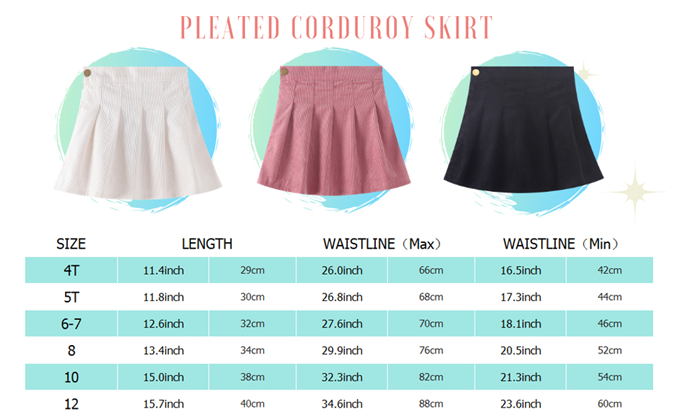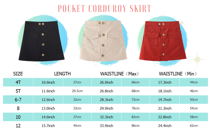 • ?INTRODUCTION:Our Gir's Corduroy skirts is made from a soft cotton corduroy fabric; this is an Above-knee skirt , a versatile casual look, you can pair it with her favorite tops, tees ,sweaters and leggings for added style.