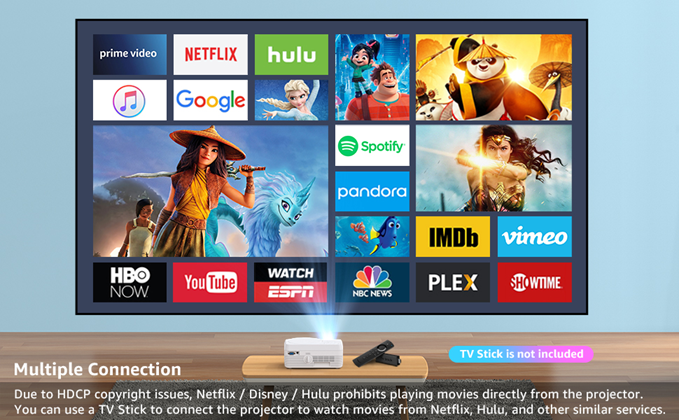 ● Netflix / Disney prohibits playing movies directly from the projector due to copyright issues. You can connect your TV stick to your projector and watch movies like Netflix and Hulu.