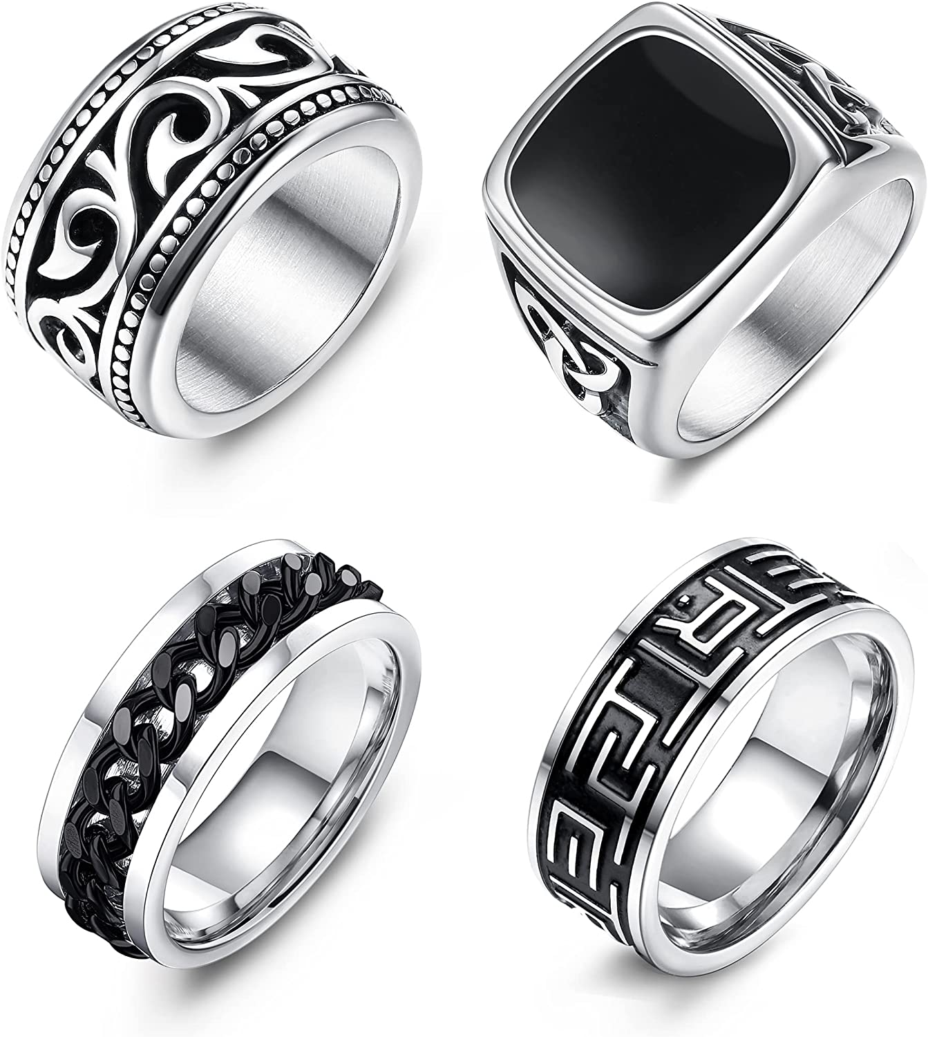 【Men's Ring Set】One Order including 4 Pcs Different Design Stainless Steel Ring.Vintage Irish Celtic Ring,Thumb Wide Ring,Mens Engraved Ring,Cuban Chain Fidget Ring.Retro Craftmanship with Exquisite Carving,Personality Cool Pattern,Giving You a Mysterious and Luxurious Feeling.