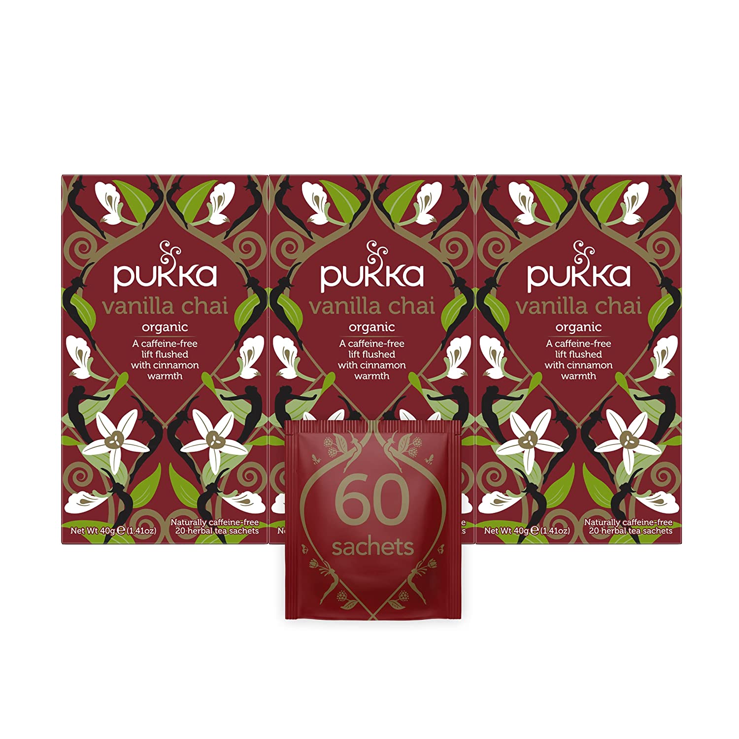 Naturally caffeine free and ethically sourced, Pukka uses 100% organically grown ingredients for their Chai products.