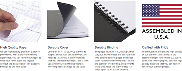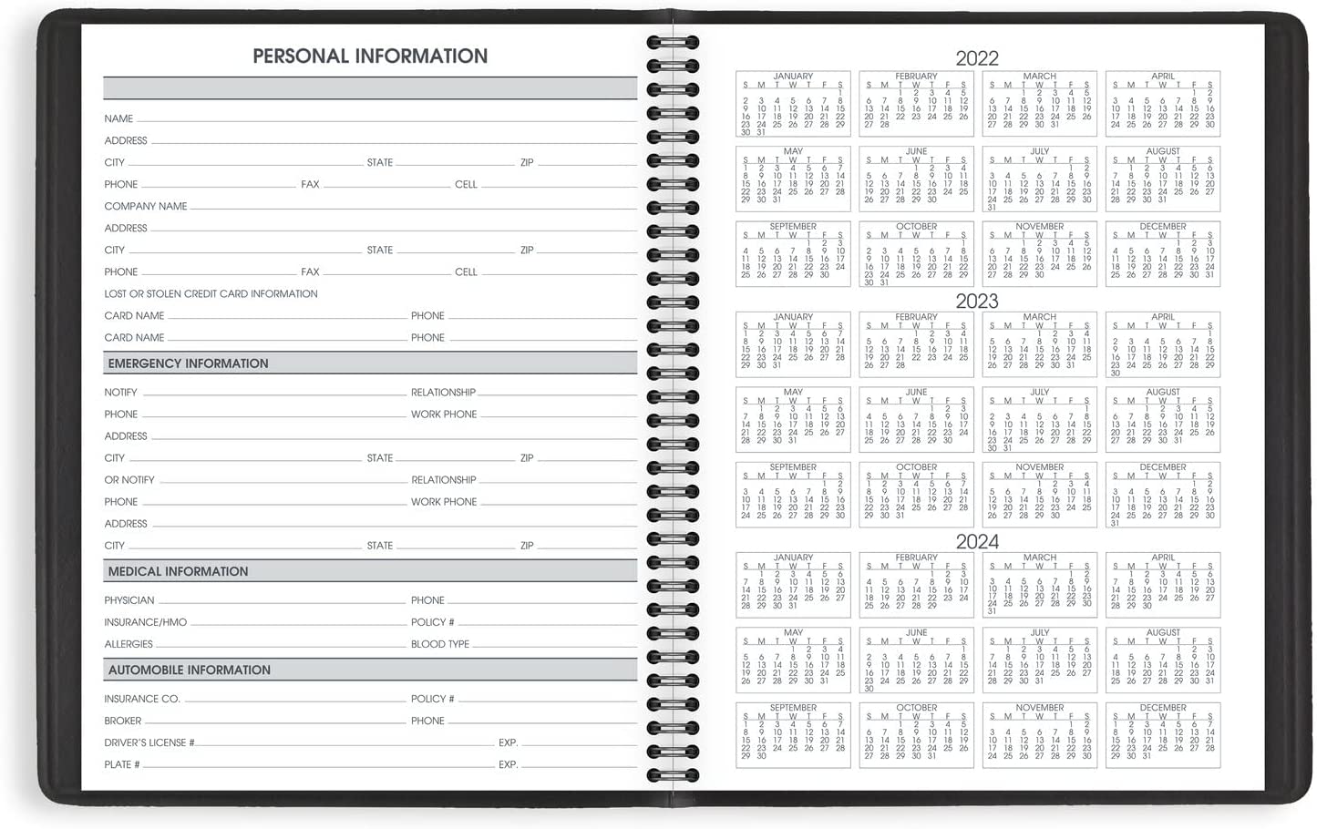 Guaranteed to last all year. Confidently face every deadline, special events and more. The AT-A-GLANCE Weekly Planner covers 13 months from January 2023 - January 2024. Plan your schedule without fear of distracting ink bleeding. Our improved, high-quality paper is designed for superior ink bleed resistance, which keeps plans neat and legible. Each day Monday-Saturday has a ruled column with 15-minute appointment times, while Sunday are condensed. Each page measures 7" x 8-3/4", with one week per two-page spread. Take charge of your schedule with classic style. Planner has a black faux leather cover and twin wire binding. Expand your organizational skills with special pages. Includes a personal information page, 3 year reference calendar and telephone/address pages. ACCO Brands will replace any AT-A-GLANCE planner that is returned within one year from the date of purchase. This guarantee does not cover damage due to misuse or abuse. Contact ACCO Brands Consumer Affairs for instructions.