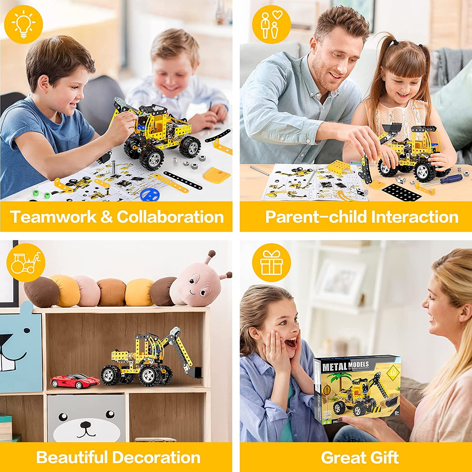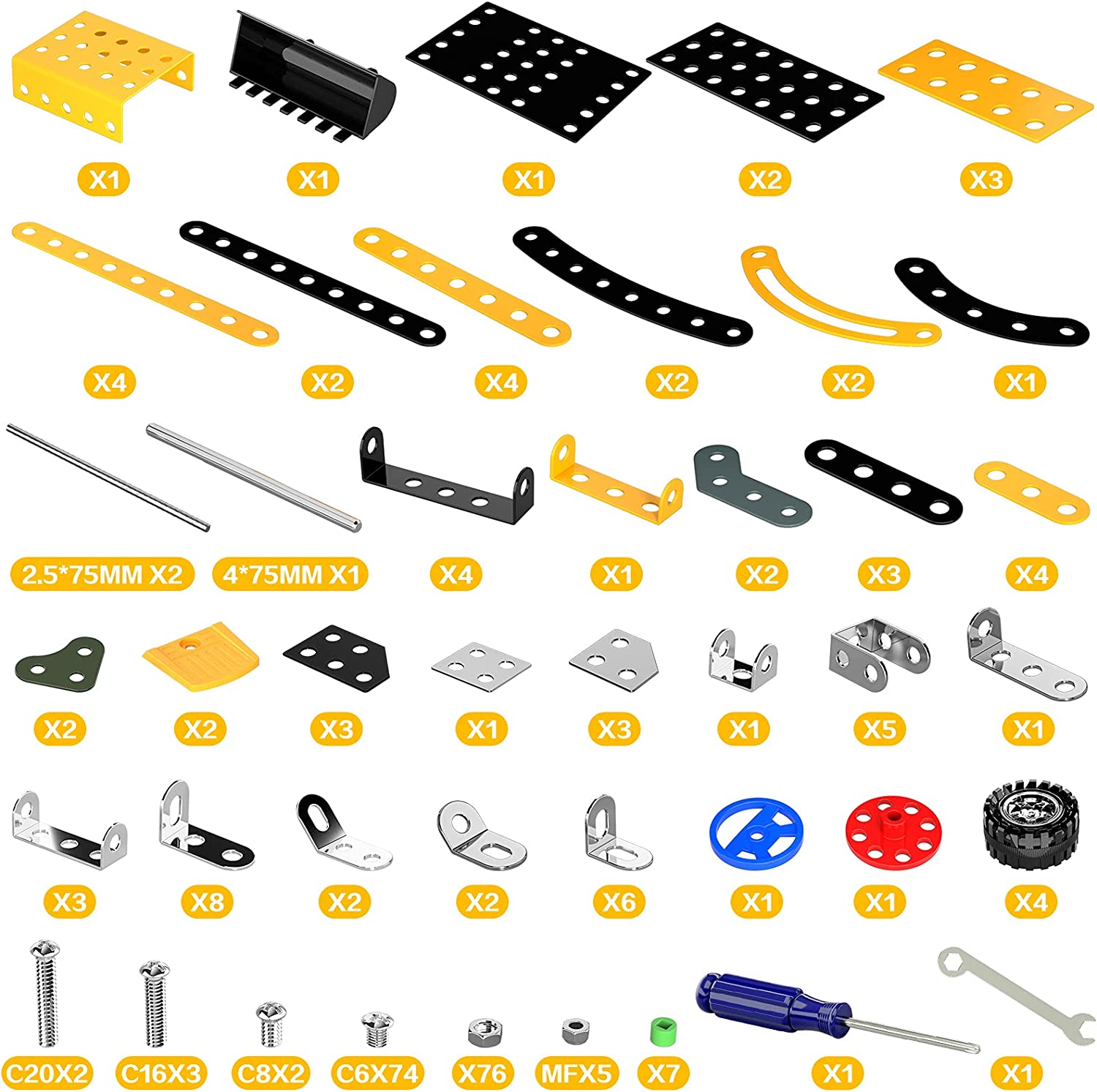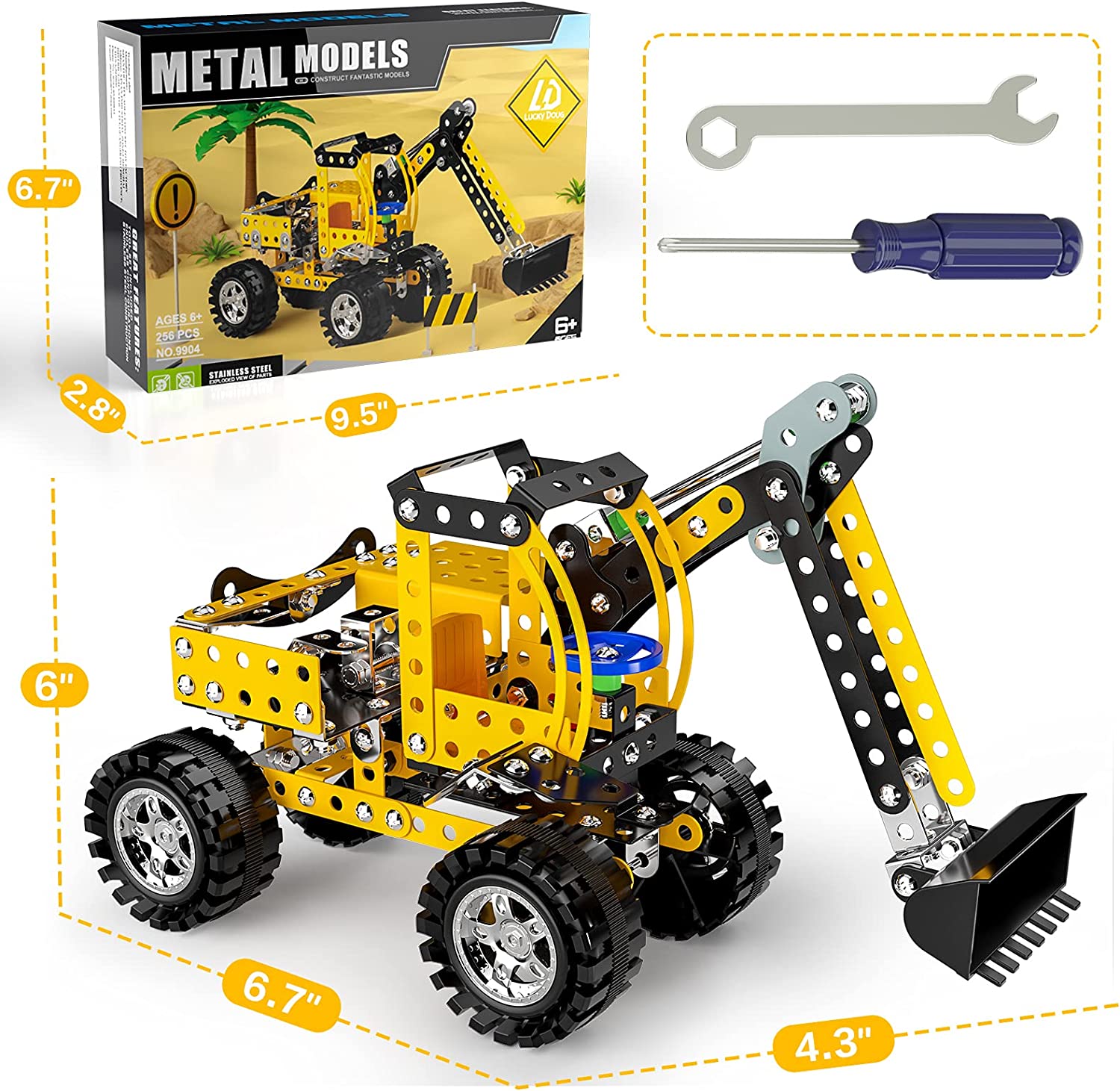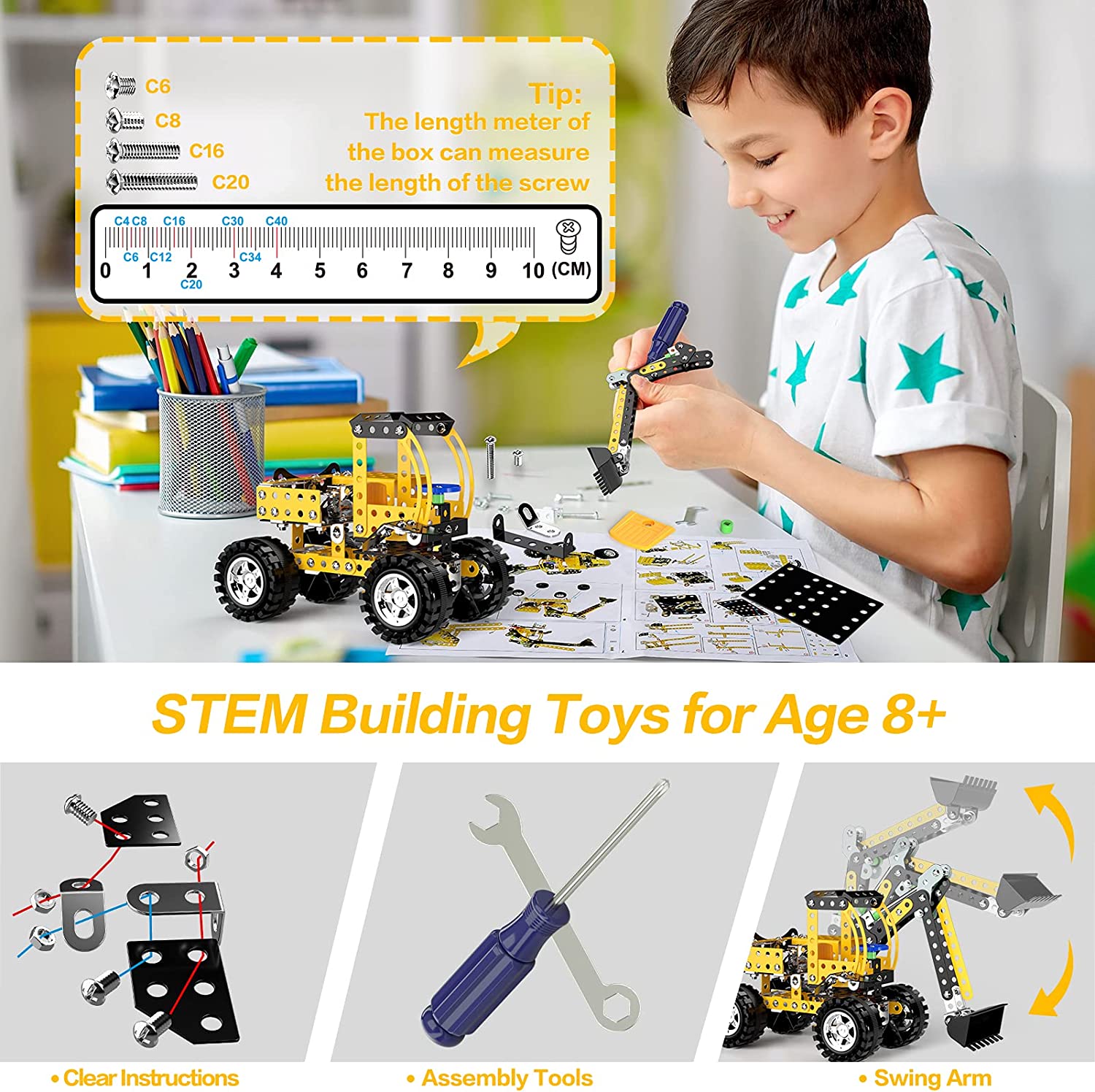 - STEM Building Toys For Kids Ages 8-12 - Our construction building toy is designed for 8+ years old kids, includes 256 parts, such as nuts, bolts, screwdrivers, and wrenches, made of durable metal. After the build is completed, The swing arm can swing freely, and the bulldozer can slide for a long distance with a little push. This stem building toy incorporates boring engineering knowledge and concepts into funny building games, aiming to improve children's STEM skills.