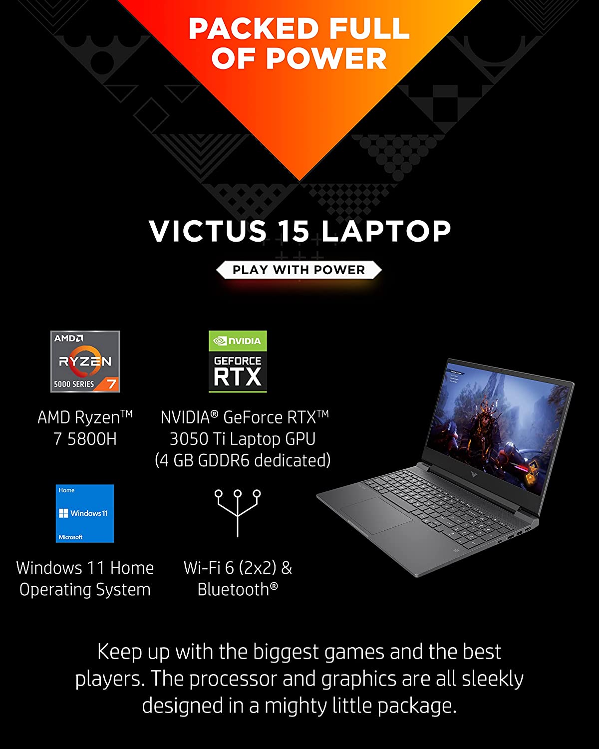 Adventure awaits with the HP Victus 15.6" Gaming Laptop PC. This sleek yet extremely powerful machine touts an AMD Ryzen 7 5800H Mobile Processor (1), AMD NVIDIA GeForce RTX 3050 Ti Laptop GPU, and 16 GB of DDR4 memory (2). Plus, this HP gaming laptop sports an FHD IPS display, combining a 144Hz refresh rate with a 9 millisecond response time for the ultimate, lag-free experience (3) (4). Run your system to the max or make simple in-game adjustments within the OMEN Gaming Hub. This laptop’s design is just as impressive as its hardware with a sophisticated Mica Silver finish. Not only does this device’s color make a statement, but so does its form; take this beauty anywhere thanks to its smaller footprint and easy portability. Run even the most demanding games with confidence, courtesy of your computer laptop’s updated thermal design that keeps your system cooled and stabilized. Featuring more finger space, an enlarged touchpad, and a dedicated OMEN Gaming Hub key, even this laptop PC’s keyboard has been designed for gamers. Experience clarity like never before with the HD camera’s Temporal Noise Reduction feature—perfect for blocking out the noise from your roommates or distracting sounds in a cafe.