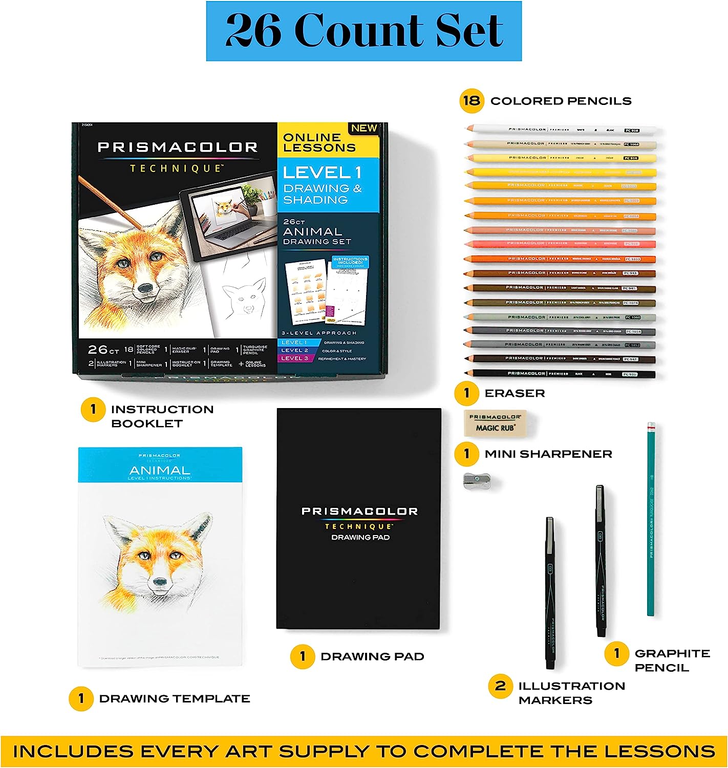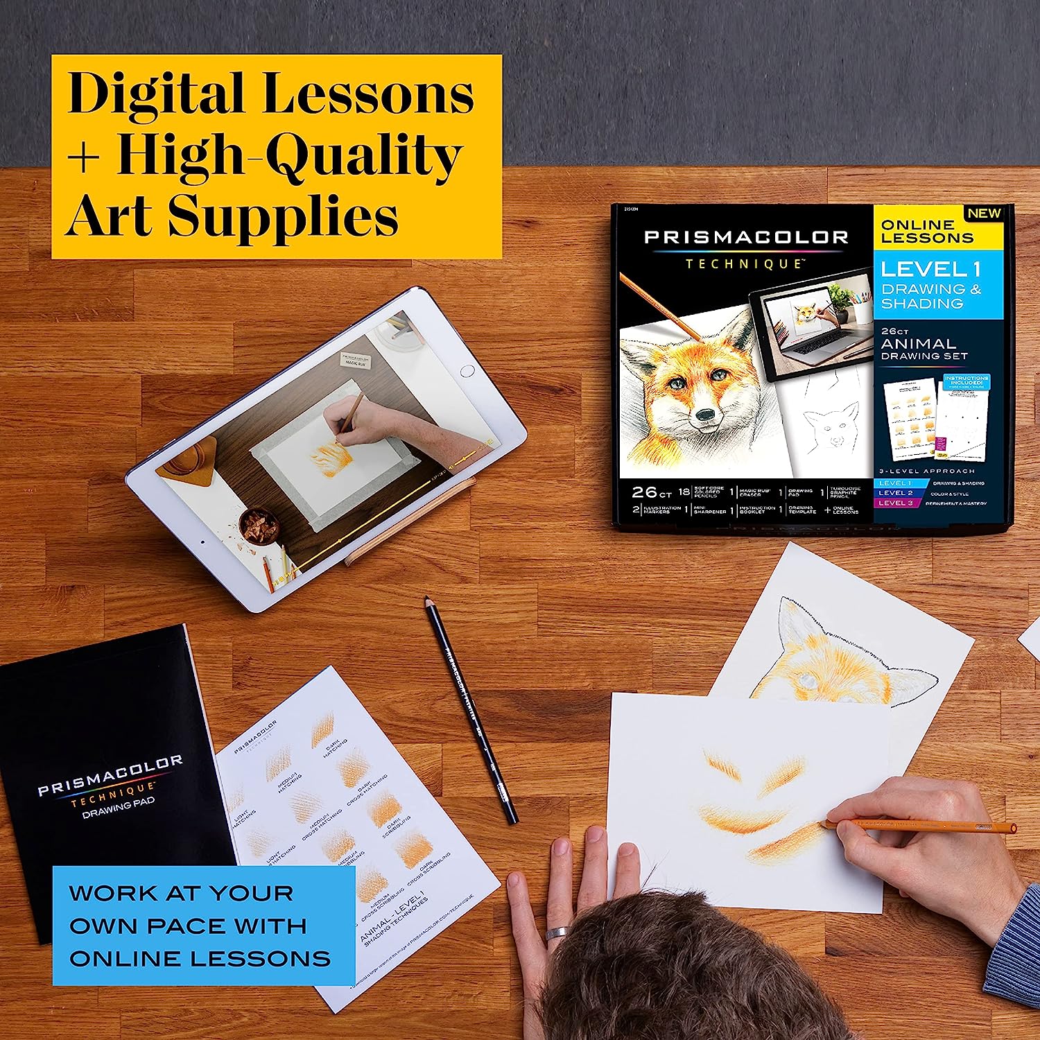 Learn art at your own pace from the comfort of home with Prismacolor Technique. Each Prismacolor Technique set features a unique coupon code for access to digital art lessons you can’t get anywhere else. Instructed by Prismacolor artists, each lesson will teach you how to use the professional-grade art supplies included in the set to create a piece of art you will cherish. The Level 1 Animal Drawing Set is designed to help those near or at the start of their art journey. You’ll practice foundational drawing and shading skills while creating a fox rich in color. The set features Prismacolor colored pencils with rich cores for smooth color laydown. You’ll also receive illustration markers, an eraser, a drawing pad, a graphite pencil, a mini sharpener, a drawing template, a set of instructions, and hours of online content to learn at your convenience!