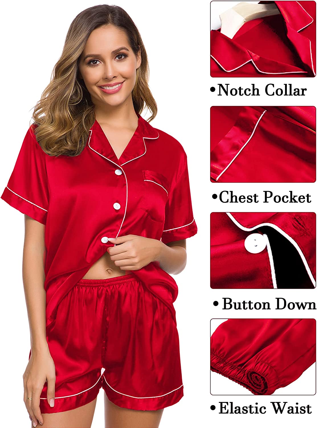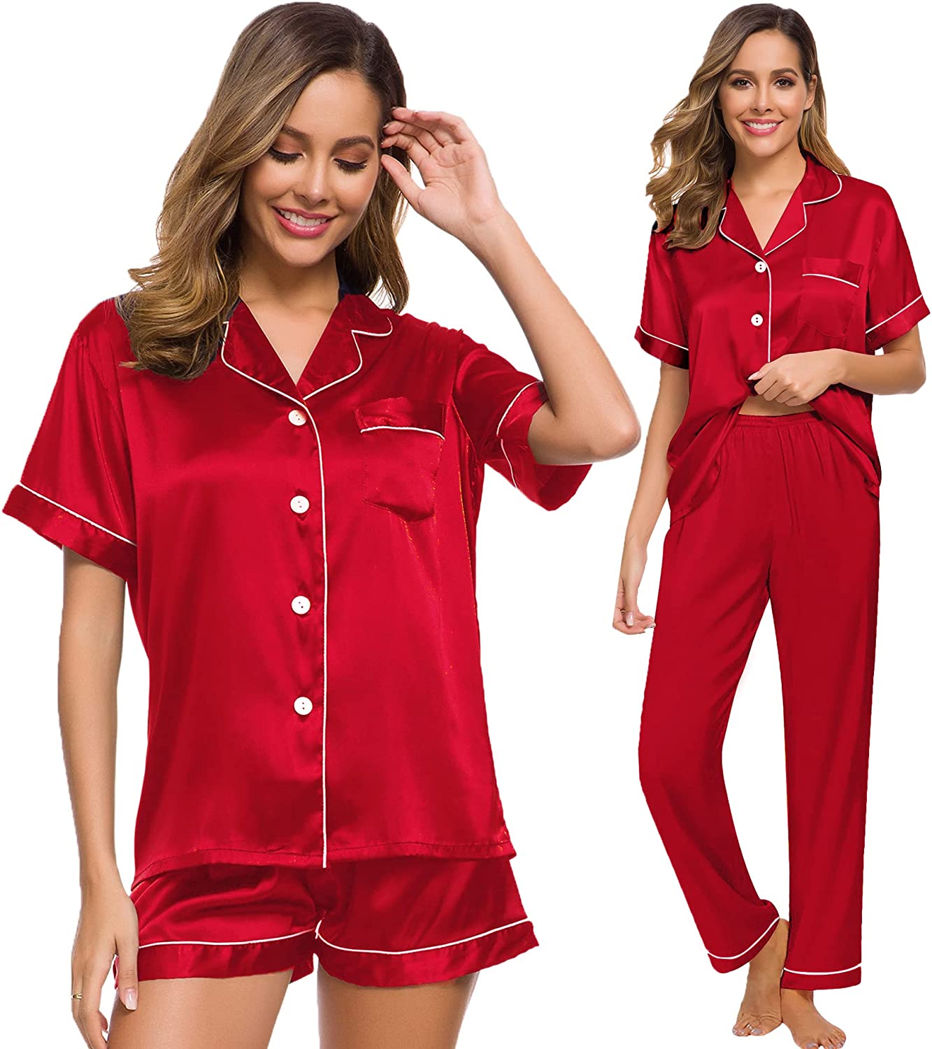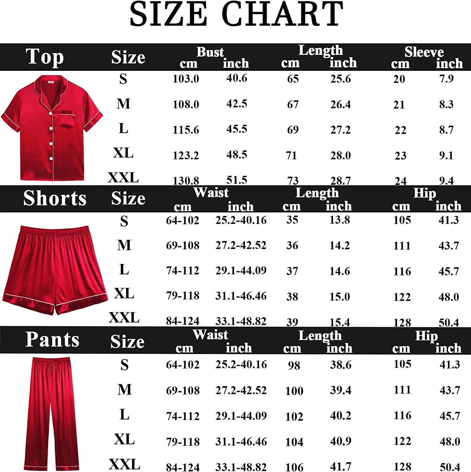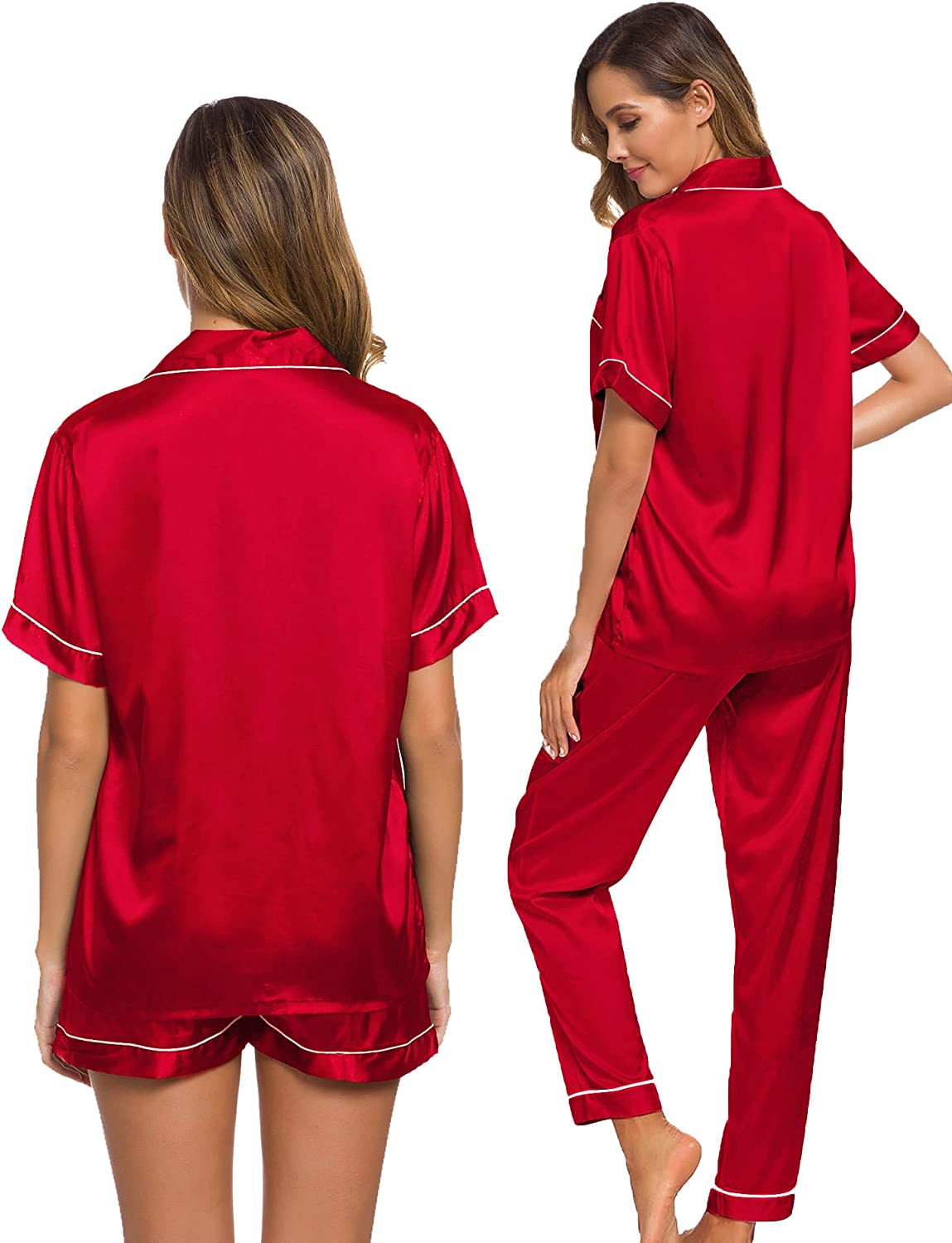 3PCS PAJAMA SET FOR WOMEN: Women's silk satin pajamas set comes with comfy short sleeve pajamas shirt, silky shorts, a pair of drawstring elastic waist pants. Classic short sleeve silk pajama set, you can match this sleepwear in differnt way to meet your needs all year around.