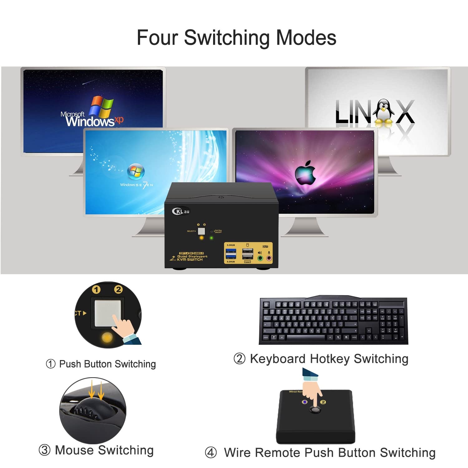 5. Displayport 1.4 KVM USB 3.0 Switch: Support auto detection, auto scan, waking up, with memory function in case of power-down. It can switch by mouse or keyboard independently, even without USB signal input, such as Apple TV, Android TV box, etc. And it can enter into BIOS interface directly. Metal case body with a premium finish, space-saving design with non-slip foot pads.