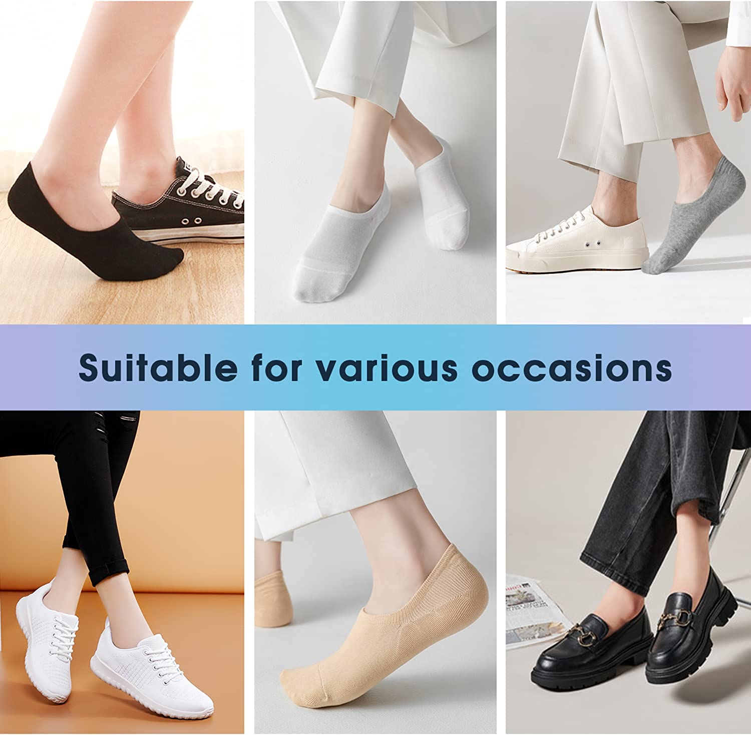 【No Show】No show and low cut invisible design goes well with most shoes such as sneakers,loafers and casual shoes. (NOTE: This sock is not suitable for a super low flat shoe) The short no see socks are available in four basic colors: black, white, nude and light gray, and 6-9/9-11 2 size ranges providing you more choices.
