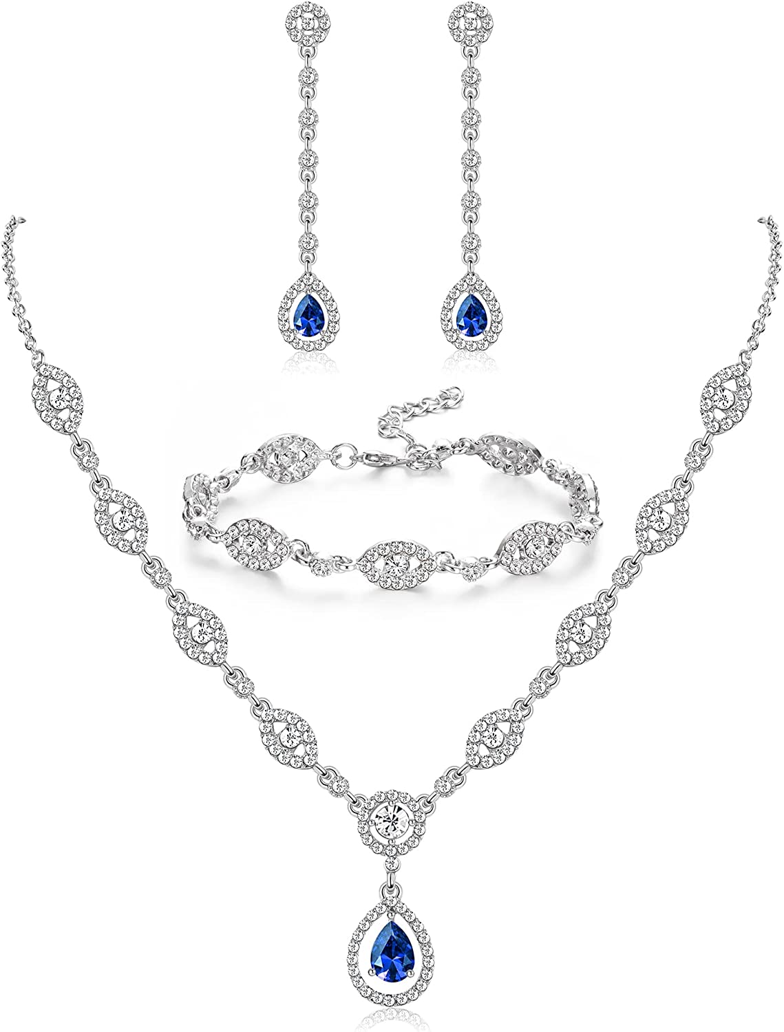 YADOCA Wedding Bridal Jewelry Set For Women Silver Prom Costume Jewelry Sets Rhinestone Crystal Teardrop Necklace Earrings Bracelet Bridesmaid Jewelry Accessories Blue Silver Red Rose Gold