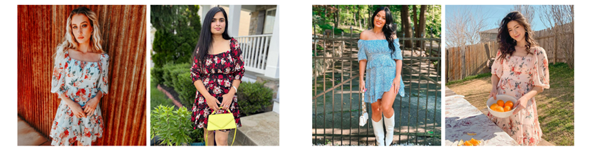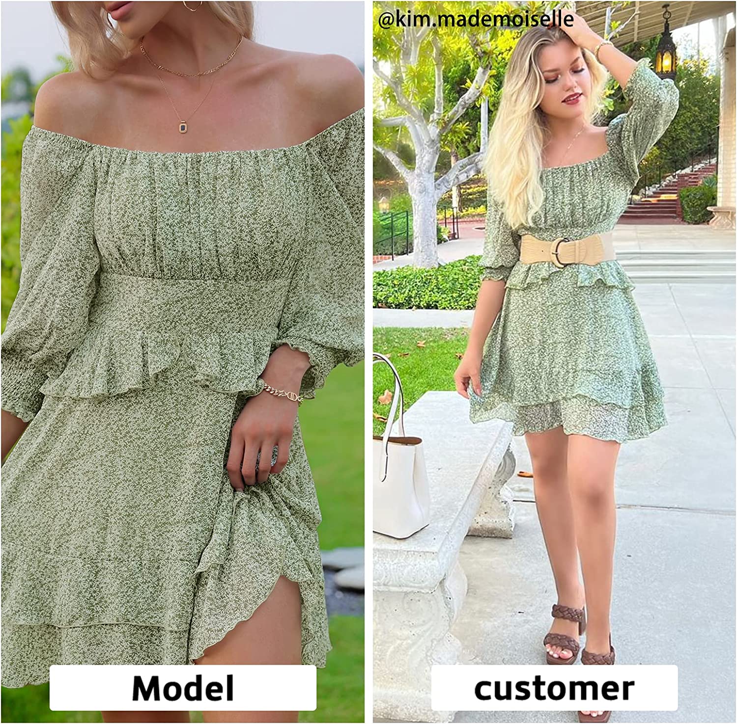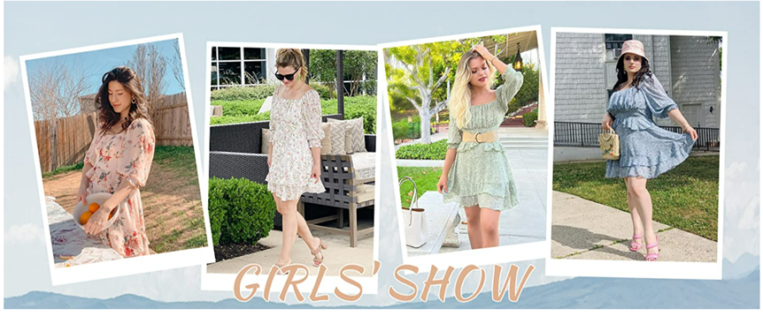 • Design: A square neck/off shoulder summer dress with ruffle hem 3/4 puff sleeves tiered design lining floral print smocked design open back frill hem ruched bust high waist a-line silhouette