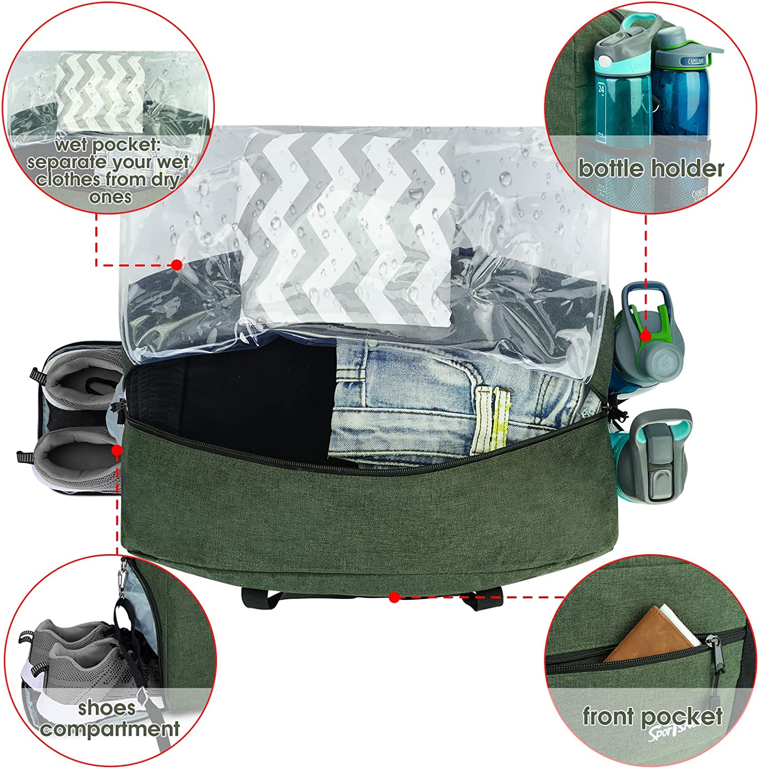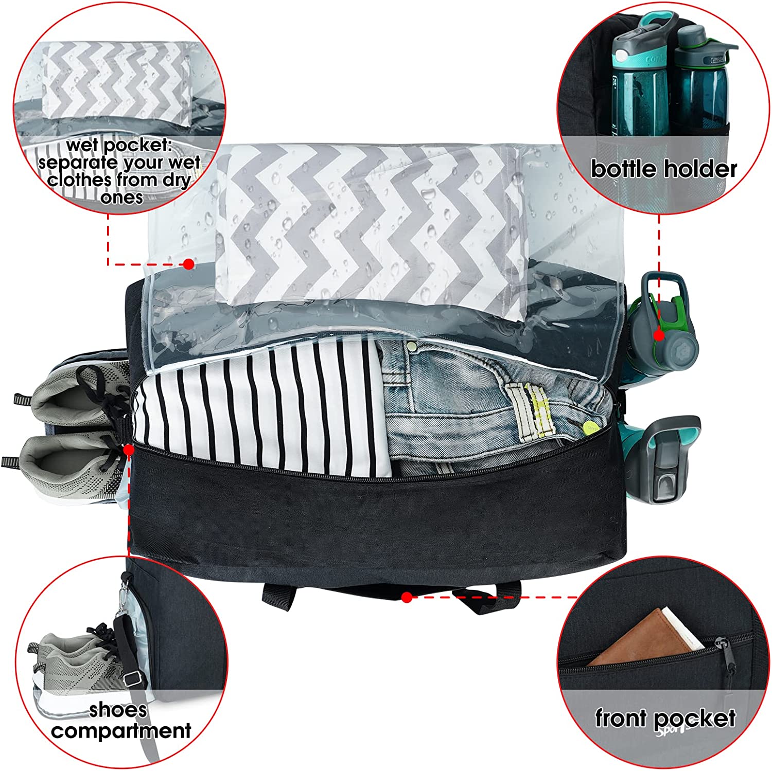 Shoes & Water Bottle Pockets Design: This sports duffel features a separated zipper compartment on the left side for shoes, laundry or dirty gear storage. Two slip-in mesh pockets on the right side are each sized to fit a water bottle( 800ml)