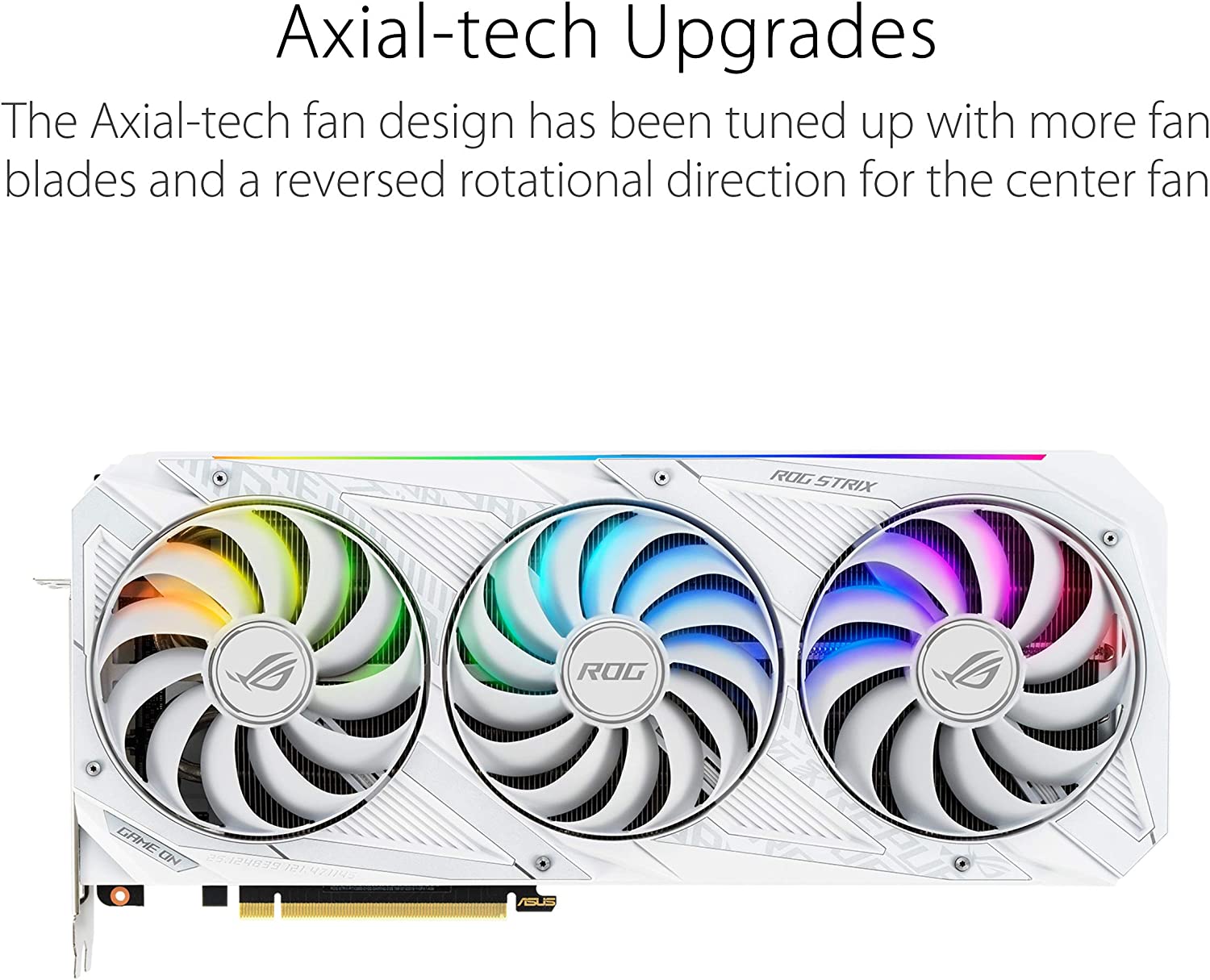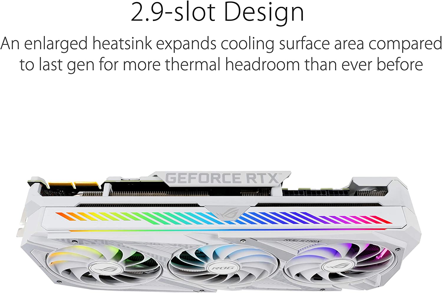 | Card Description | The ROG STRIX GeForce RTX™ 3090 White OC Edition 24GB GDDR6X adds to the NVIDA Ampere Architecture with a white color scheme, Axial-tech fan design, 0dB technology, 2.9-slot Design, Dual BIOS, Auto-Extreme Technology, SAP II, MaxContact Technology, and more. |