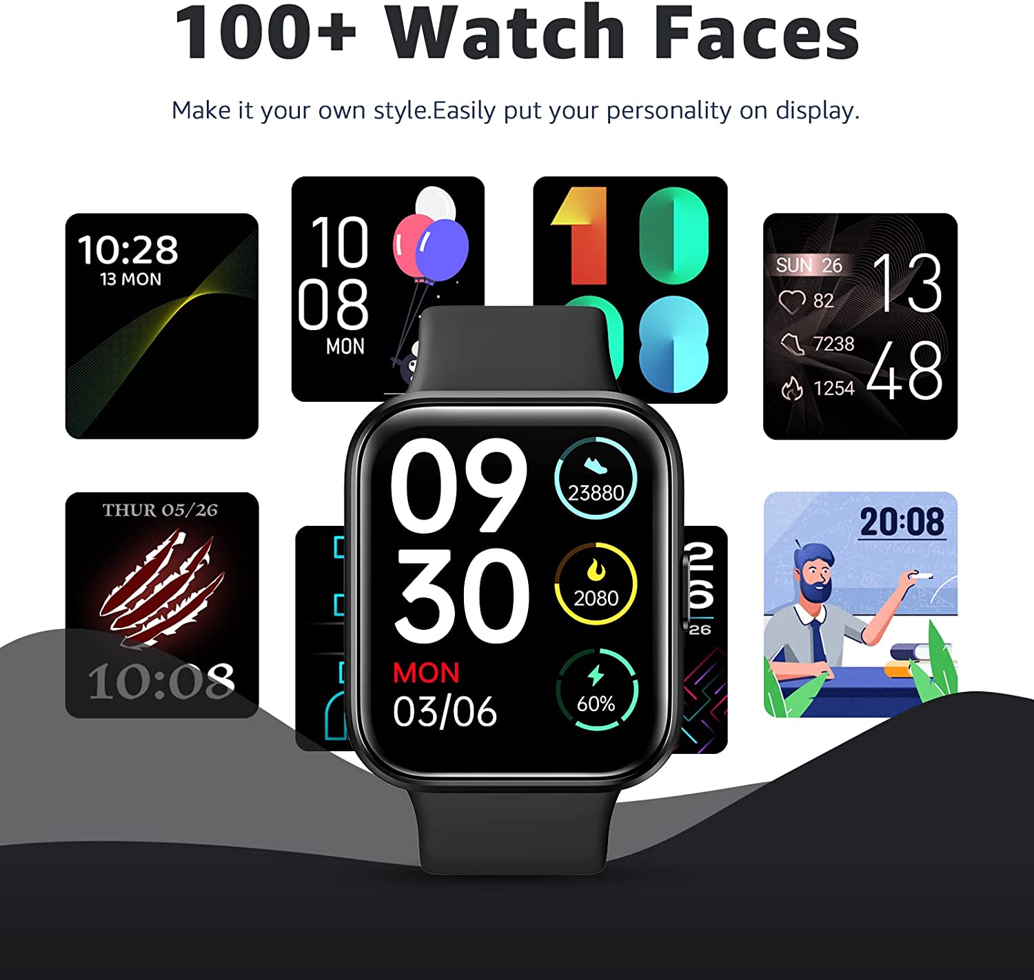 8 Customized Watch Faces 60 Sport Modes-60 sport modes that more accurate to track your activities like heart rate, Calories burned, Steps, Gps record, Sport time, Sport speed and so on.Support multiple reminders and stay connected to your daily life