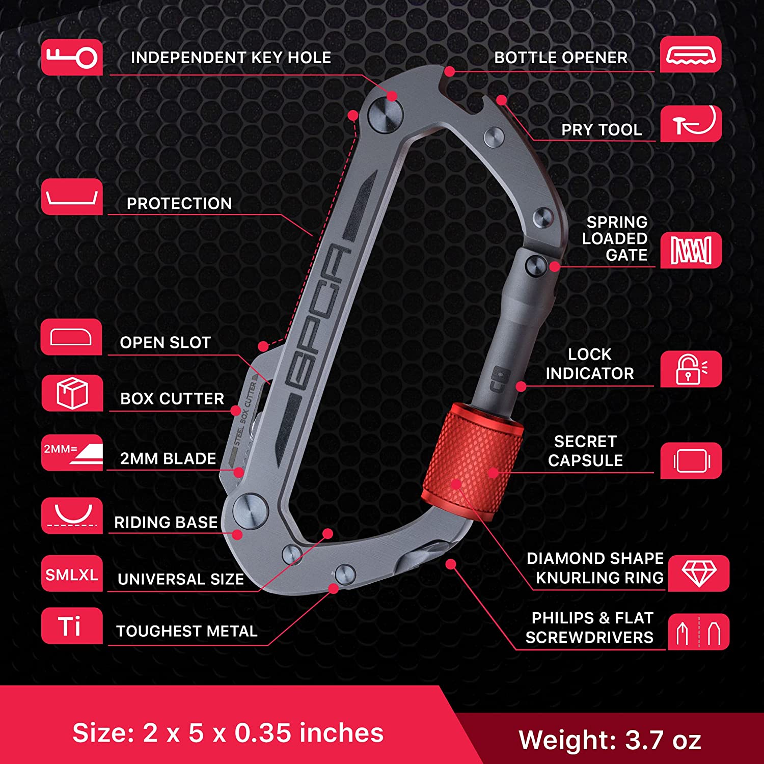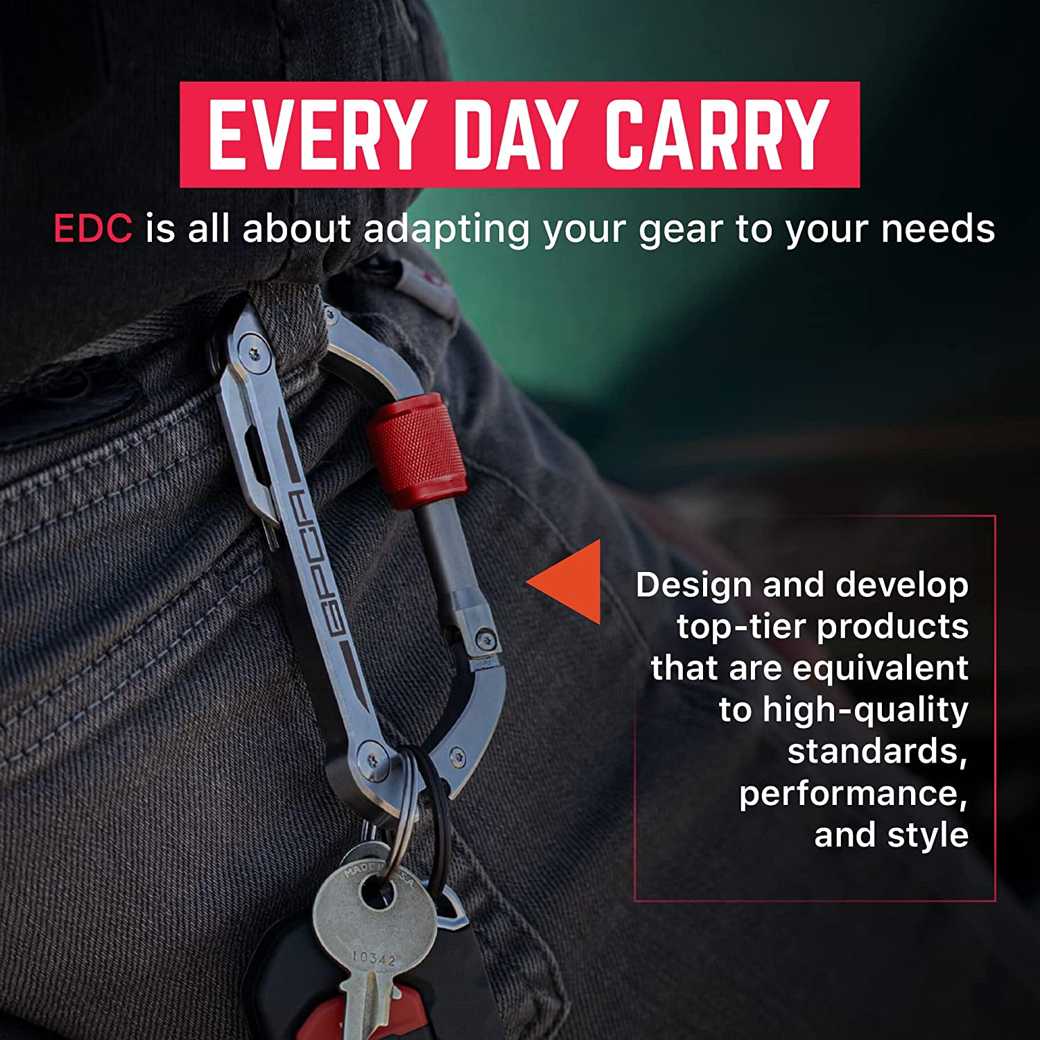 • VERSATILE UTILITY TOOL - Always be prepared for everyday tasks and outdoor activities with our keychain carabiner. This EDC carabiner works as a handy multi-tool. Use it as a bottle opener, dog leash handle, box cutter, pry tool and more.