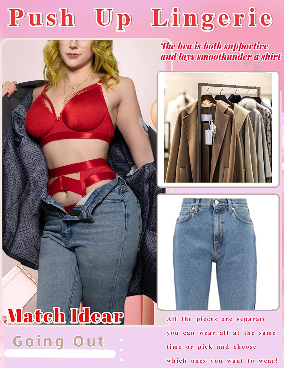 ✿Style: Bondaged Lingerie Strappy 4 Piece Lingerie Set comes with a matching g-string panty and a unique belt and garter belts, perfectly enhance femininity and show your curve, making you more charming. The bra hugs perfectly. No spillage or slips.