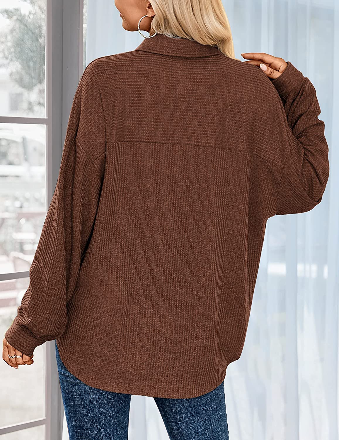 Hotouch Waffle Button Down Shirt Women Casual Knit Tops Long Sleeve Loose Fit Shacket with Pocket
