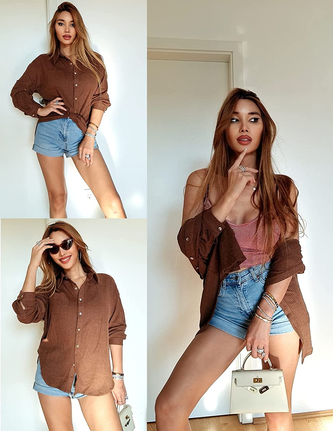 • Match All Styles: Waffle shacket women button down shirts can be matched with short jeans, skinny leggings, hot pants, fashionable and vintage, button up shirt women is a must-have for any ladies,it goes well with everything.