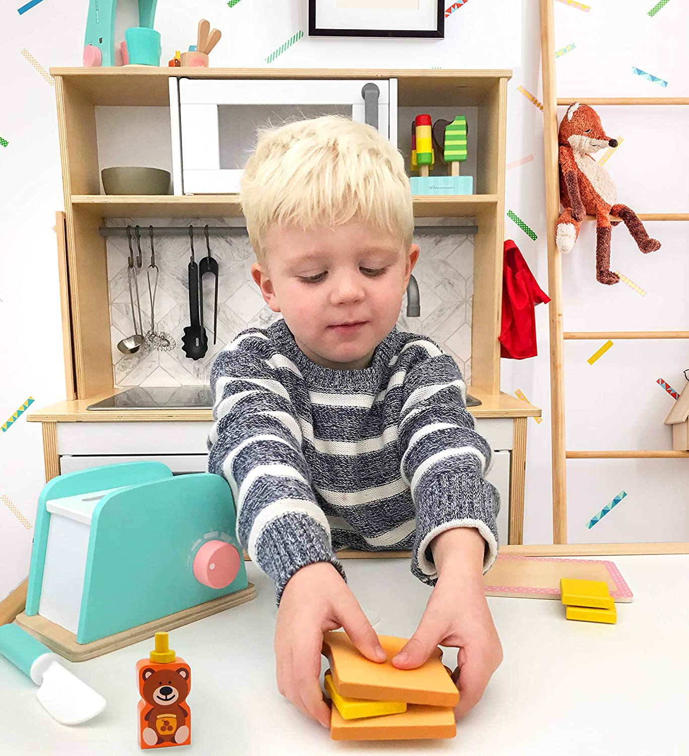 • ?Interactive Toy Pop-Up Toaster for Kids – This Pop-Up Toaster toy kitchen set contains premium wooden Toaster with an exclusive designed chopping board, 3 slices of butter and 2 slices of bread, knife, poached egg and a bottle of honey bear. With all of this kitchen tools and food, kids are able to cook their own breakfast. Plus, if you already have the set of the Tiny Land Wooden Coffee Maker, then kids can start off their morning the with delicious toast together with a cup of coffee!
